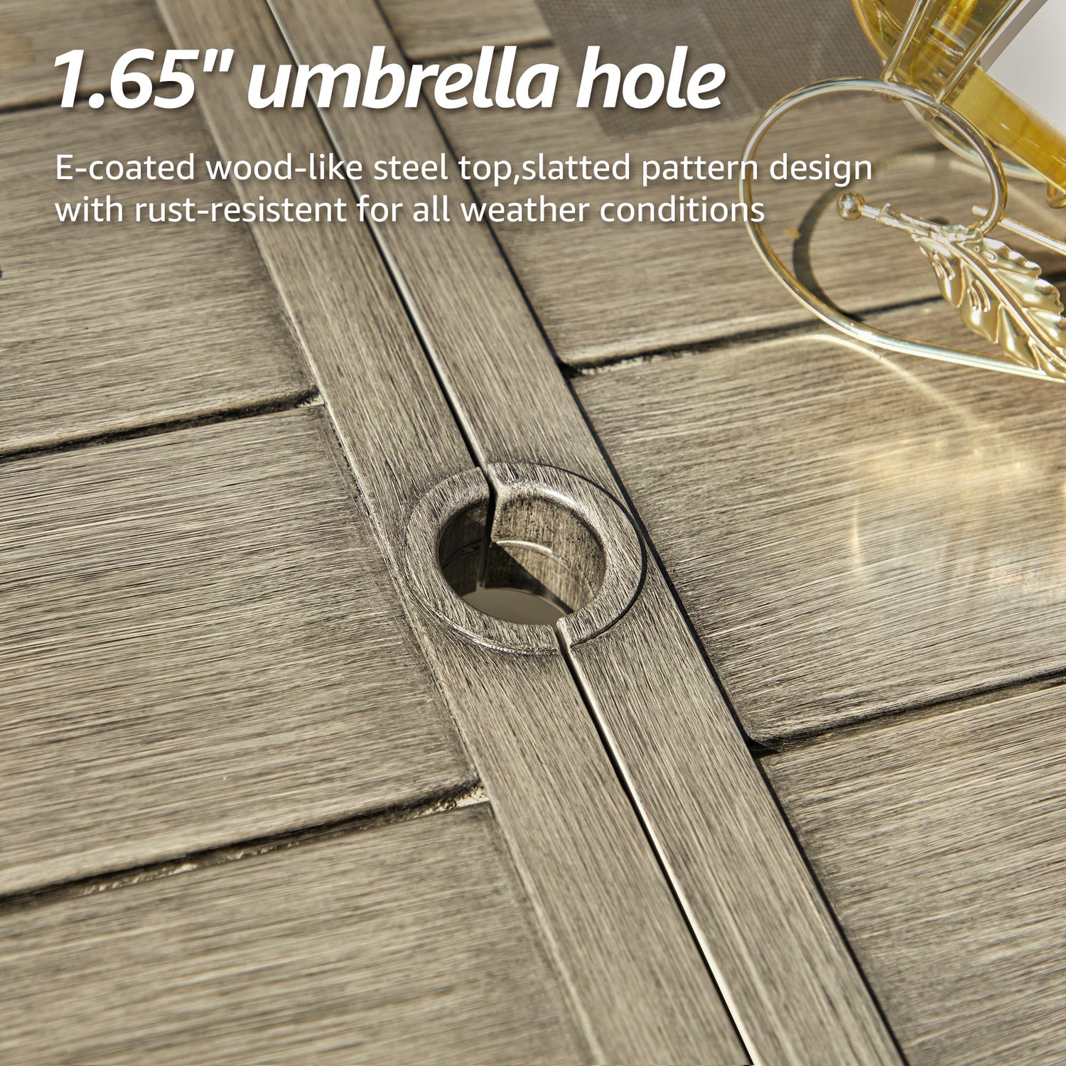 - [Large Patio Dining Table with Umbrella Hole] 70" x 38" Large rectangle surface for 6 people, enough space for your leisure time with your friends or family. The center pre-cut 1.65 '' umbrella hole allows you to add an umbrella to protect you and your family from UV damage. The wood-look table top design is stylish and beautiful, suitable for any occasions.