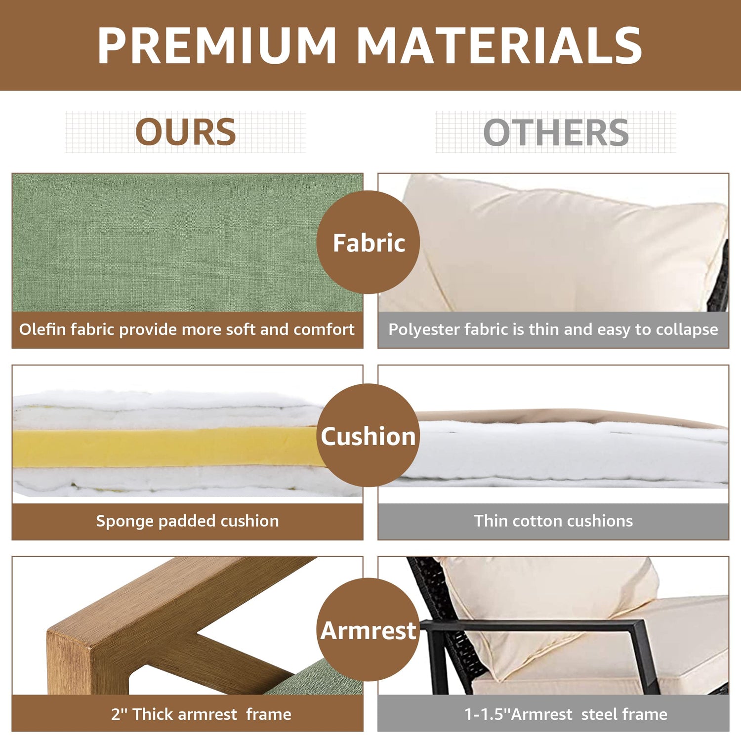 - 【Large Frame Size and Spacious Chairs】Chairs and tables are designed with thick and strong steel, and the width of the armrest pipe is 2 inches provide enough room to seat comfortably. Our thick olefin cushions are all made of high desity sponge with 6.5 inches ,which is more breathable for your comfort. This outdoor furniture set can be used in the courtyard, backyard, porch, garden, poolside, balcony.