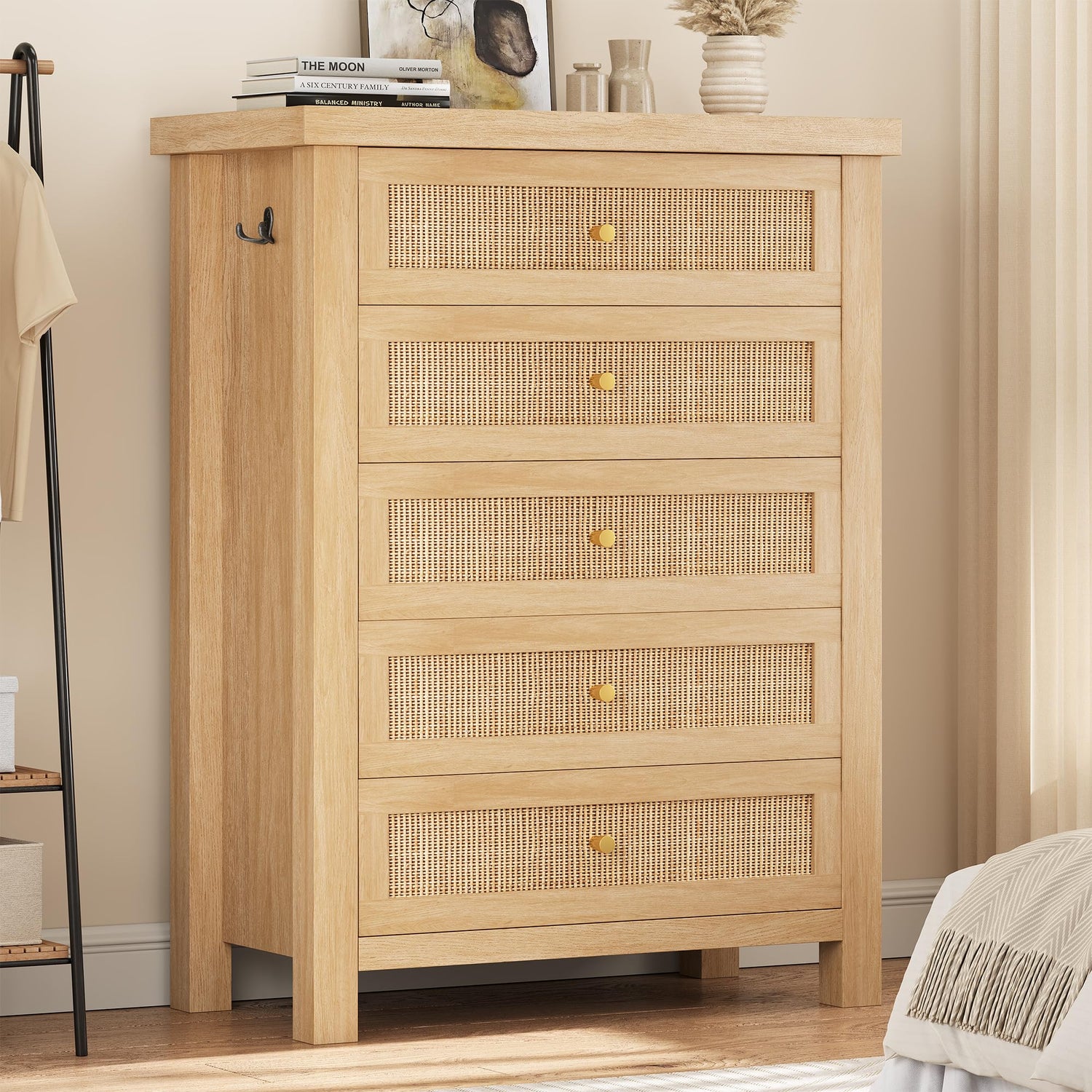 Natural Rattan Dresser for Bedroom with 5 Drawers, Wood Boho Chest of Drawers with Gold Metal Handle, Matte Top Bedroom Tall Dresser with Large Drawers for Living Room, Closet, Hallway, (Nartual Oak)
