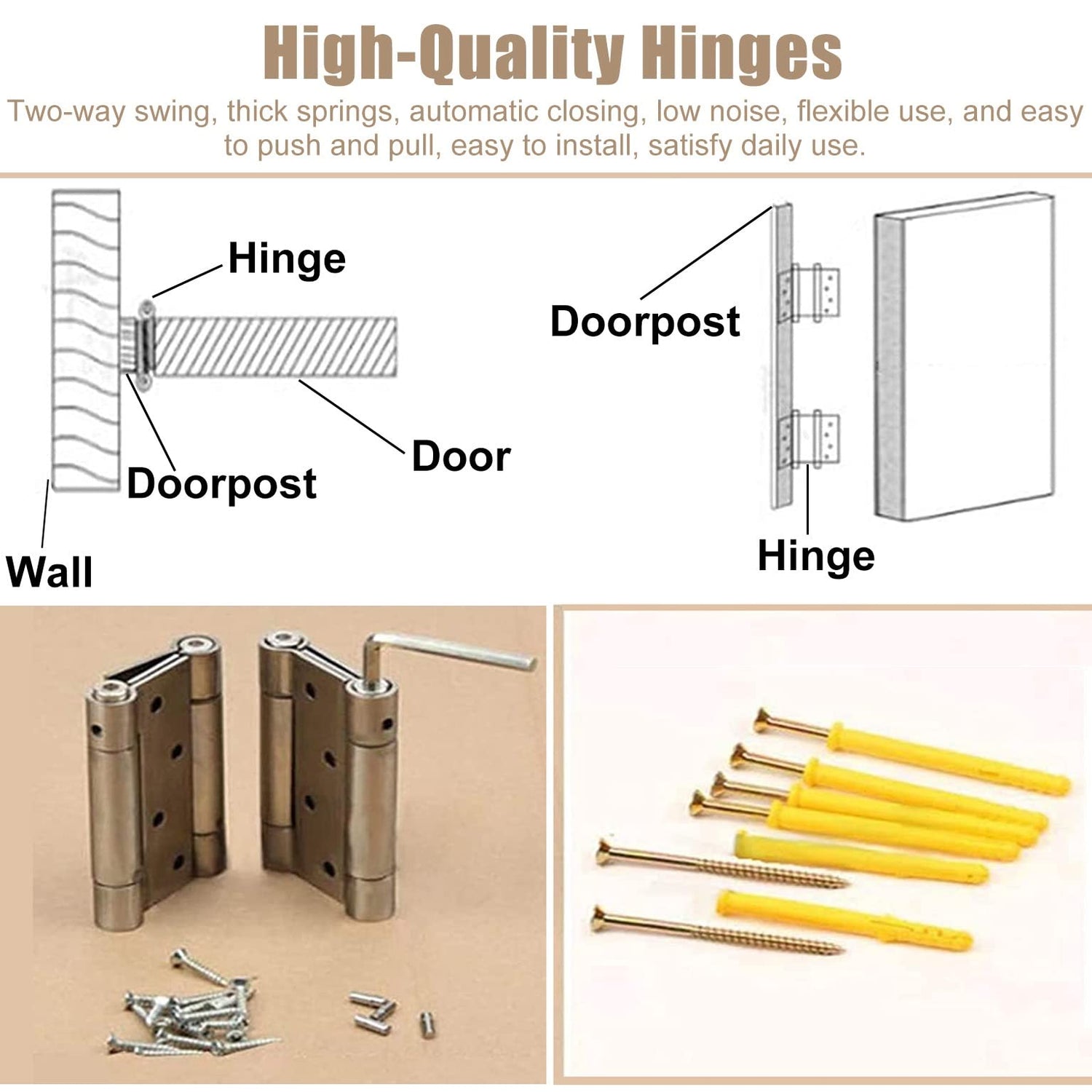 - 【 Automatic closing 】High-quality Hinges Two-way swing,thick springs, automatic closing,low noise,flexible use,and easy to push and pull,It is more convenient to let one or two bar door panels stay in the open position when needed. Two-way swing function, auto close and stay open, one or both doors stay open when needed.satisfy daily use.