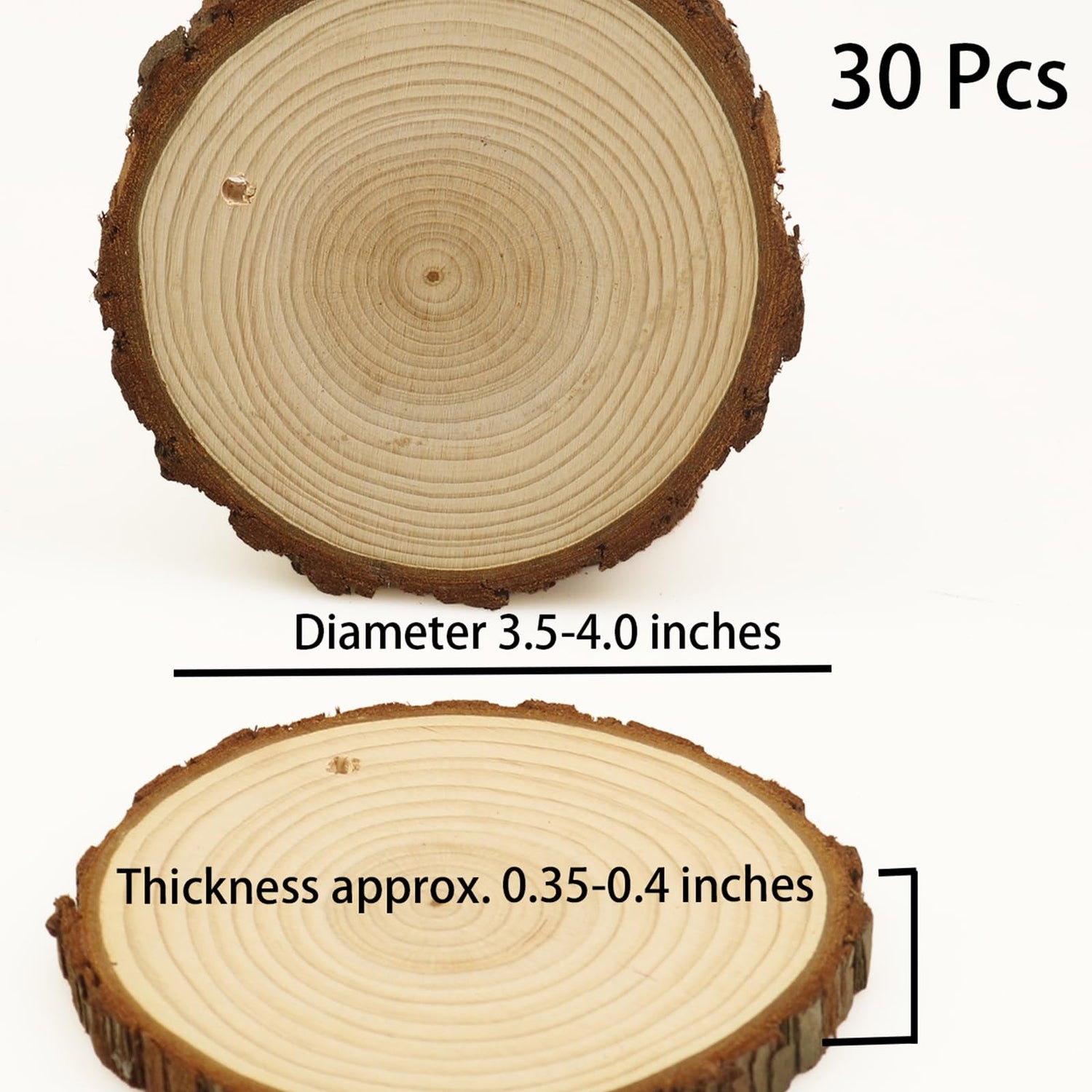 - ASSIRES Wood Slices -Natural Beauty of these 30 Pcs wooden rounds, these round wooden discs provide a rustic and authentic touch to your crafts. Each slice measures between3.5 to 4 inches in diameter, ensuring a generous size for your projects.