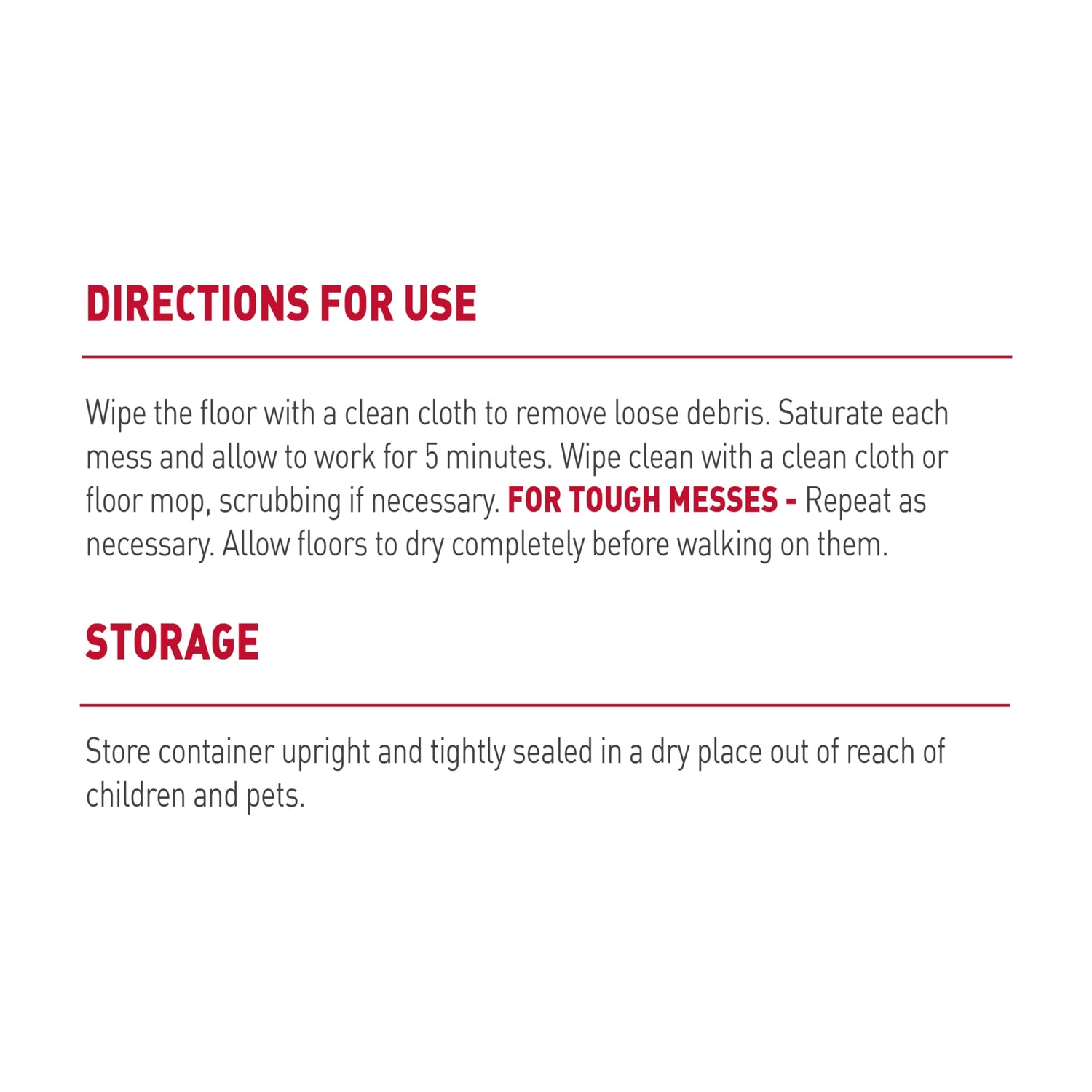 Details: Nature’s Miracle Hard Floor Cleaner is a dual-action pet stain and odor remover. This bio-enzymatic formula works to destroy tough pet stains and odors on hard surfaces, providing a deep clean while protecting the natural floor finish. Nature’s Miracle® Hard Floor Cleaner safely works to remove new and deep-set stains and odors from sealed wood, tile, linoleum, vinyl and more! Convenient and ready to use, this product starts breaking down stains and odors on contact and is safe for your pets and home.* Plus, it’s formulated with odor-neutralizing OdorCapture 360™ technology. To use, wipe the floor with a clean cloth to remove loose debris. Saturate each mess and allow to work for five minutes. Wipe clean with a clean cloth or floor mop, scrubbing if necessary. For tough messes, repeat as necessary. Allow floors to dry completely before walking on them. *When used and stored as directed"