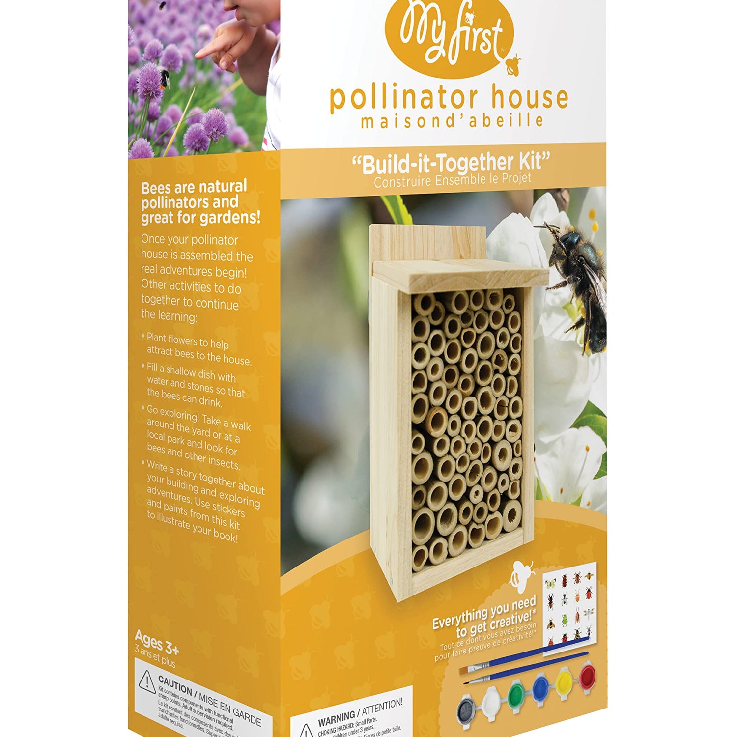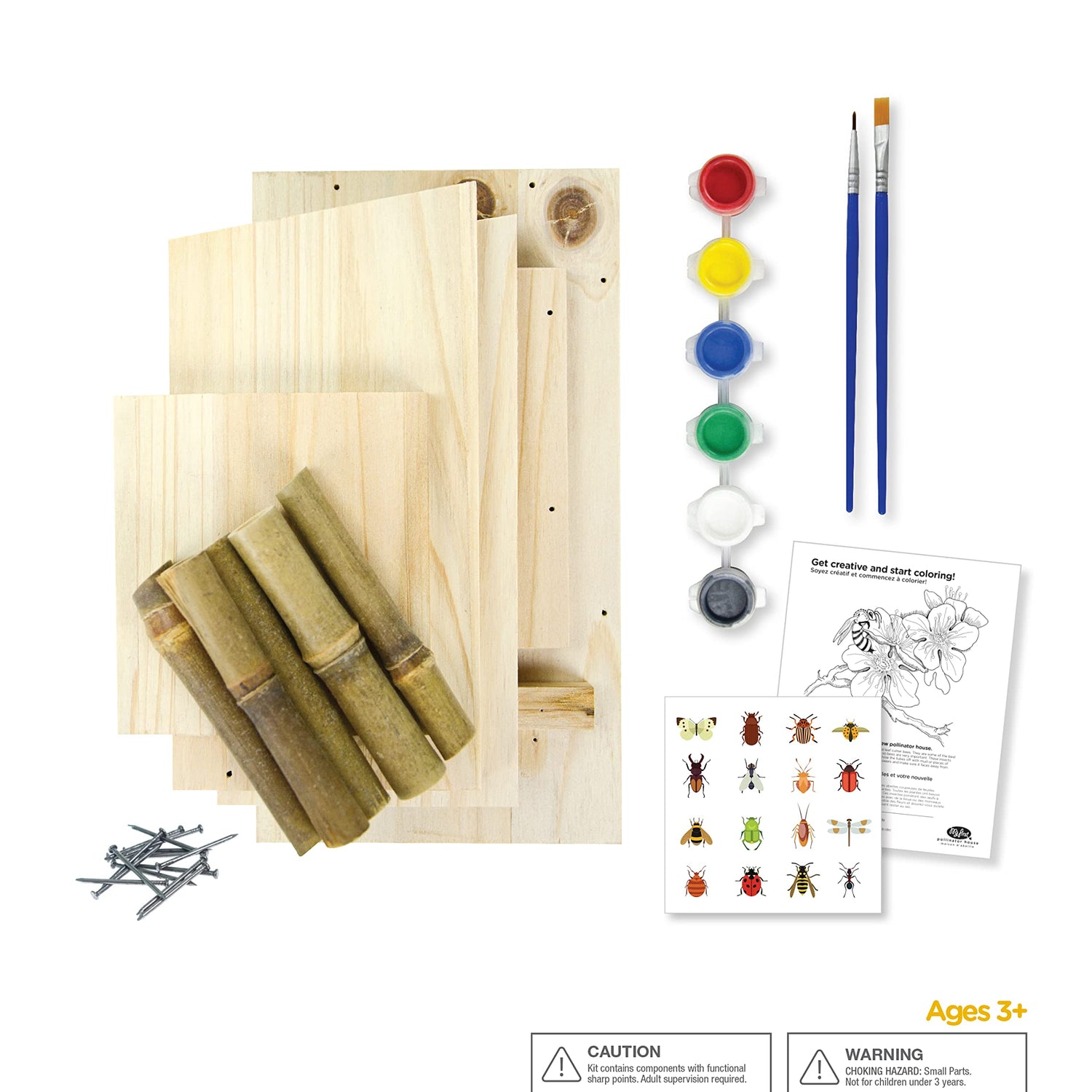 Details: Have more fun hands-on learning experiences with your child when you build and decorate My First Pollinator House together! Help your child learn about the benefits of gentle native bees and power pollinators as you build it, decorate it, and watch your pollinator friends move in. This "Build-it-Together Kit" includes everything you need to get creative: pre-cut wood pieces, nails, bamboo tubes, 6 acrylic paints, 2 paint brushes, stickers, and easy-to-follow instructions. The fun isn’t done once the kit is assembled - every kit comes with more hands on activity suggestions so you can continue learning together. WARNING: CHOKING HAZARD - Contains small parts. Not for children under 3 years of age. CAUTION: Kit contains components with functional sharp points. Adult supervision required.