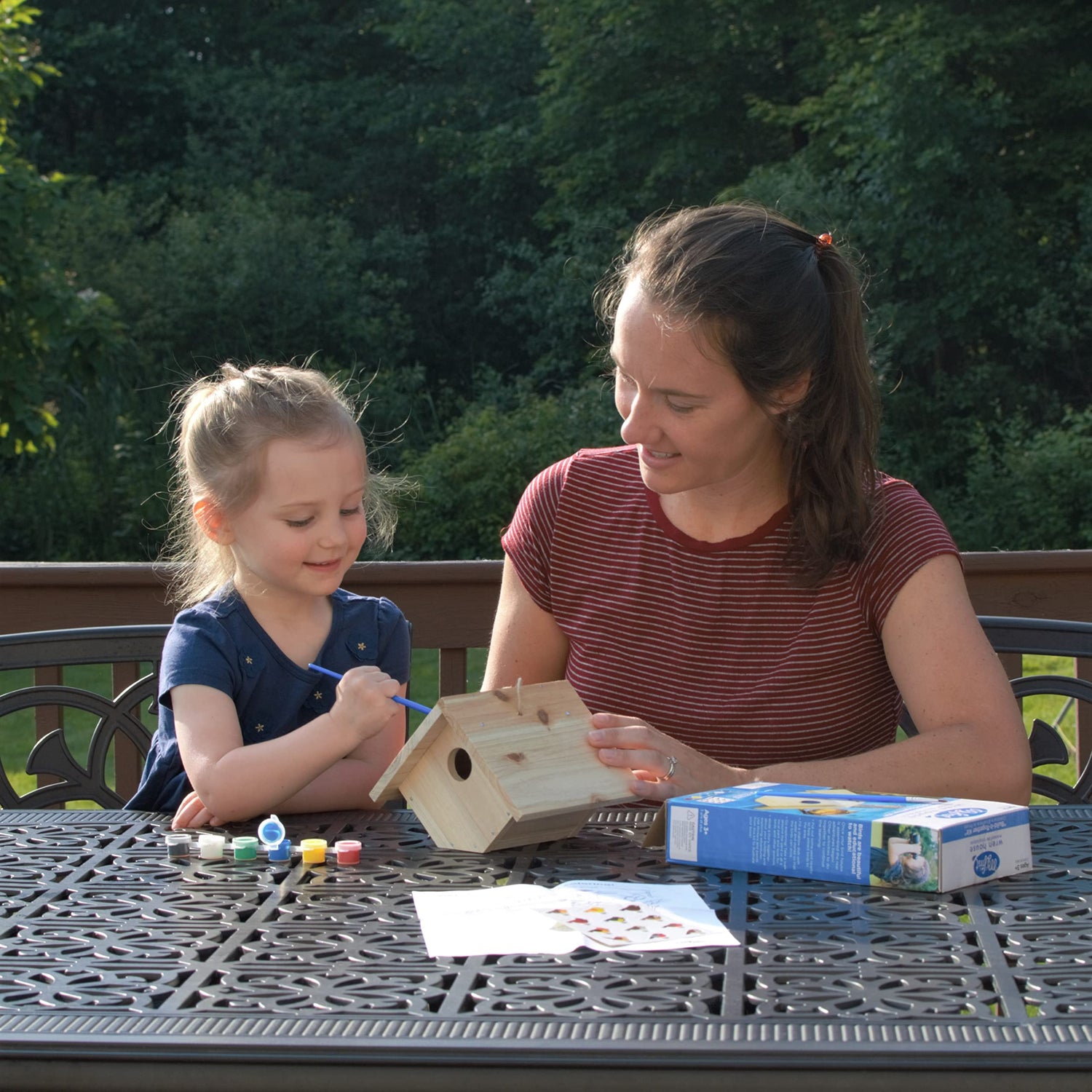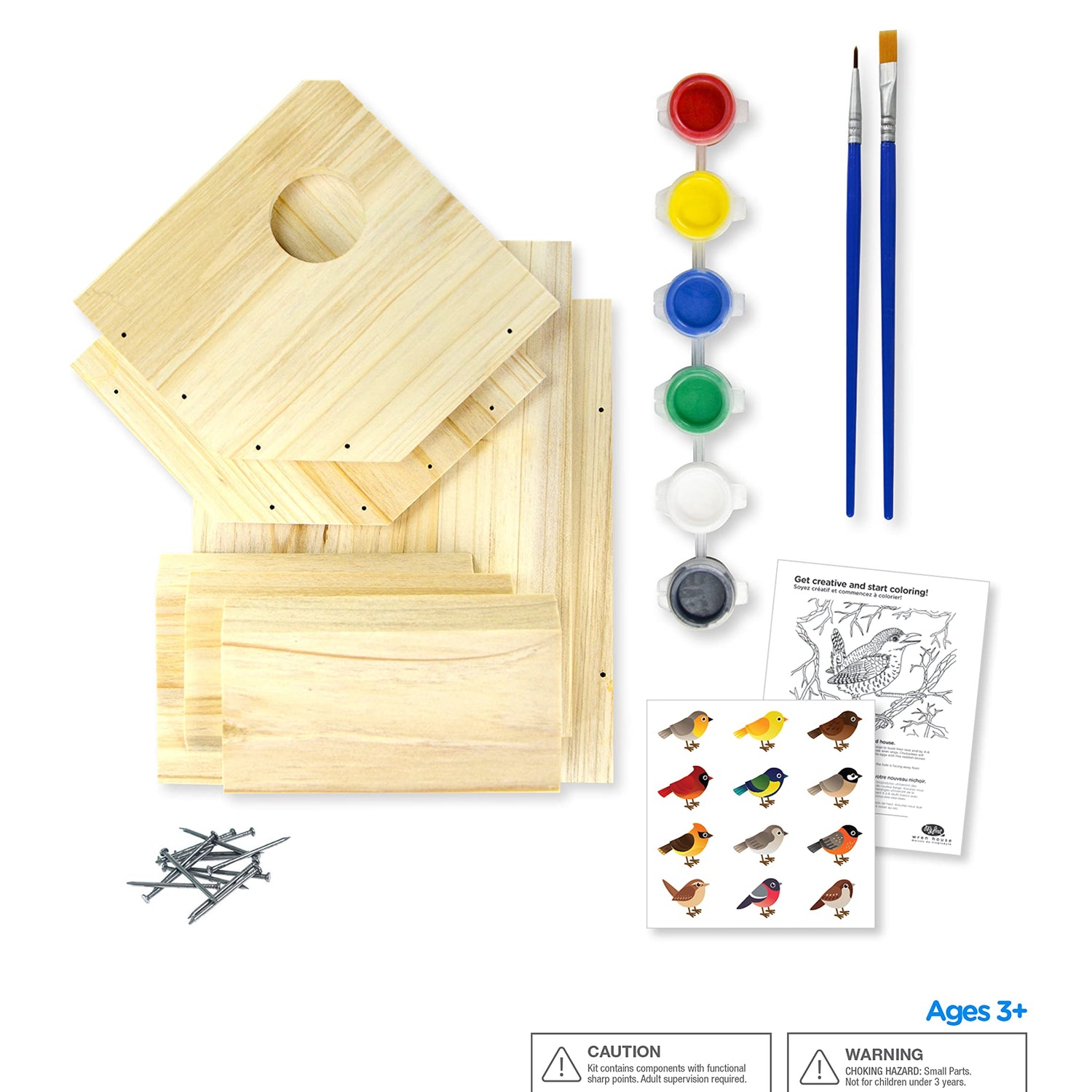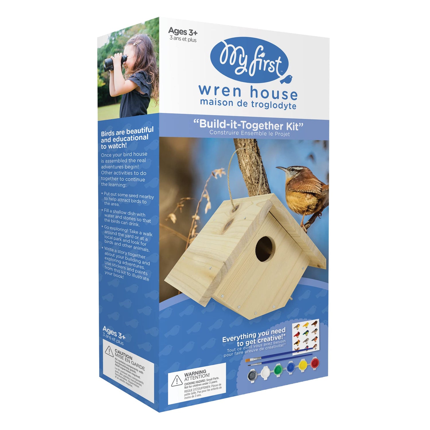 Details: Have more fun hands-on learning experiences with your child when you build and decorate My First Wren House together! Help your child learn about bird identification and conservation as you build it, decorate it, and watch your feathered friends move in. This "Build-it-Together Kit" includes everything you need to get creative: pre-cut wood pieces, nails, rope hanger, 6 acrylic paints, 2 paint brushes, stickers, and easy-to-follow instructions. The fun isn’t done once the kit is assembled - every kit comes with more hands on activity suggestions so you can continue learning together. WARNING: CHOKING HAZARD - Contains small parts. Not for children under 3 years of age. CAUTION: Kit contains components with functional sharp points. Adult supervision required.
