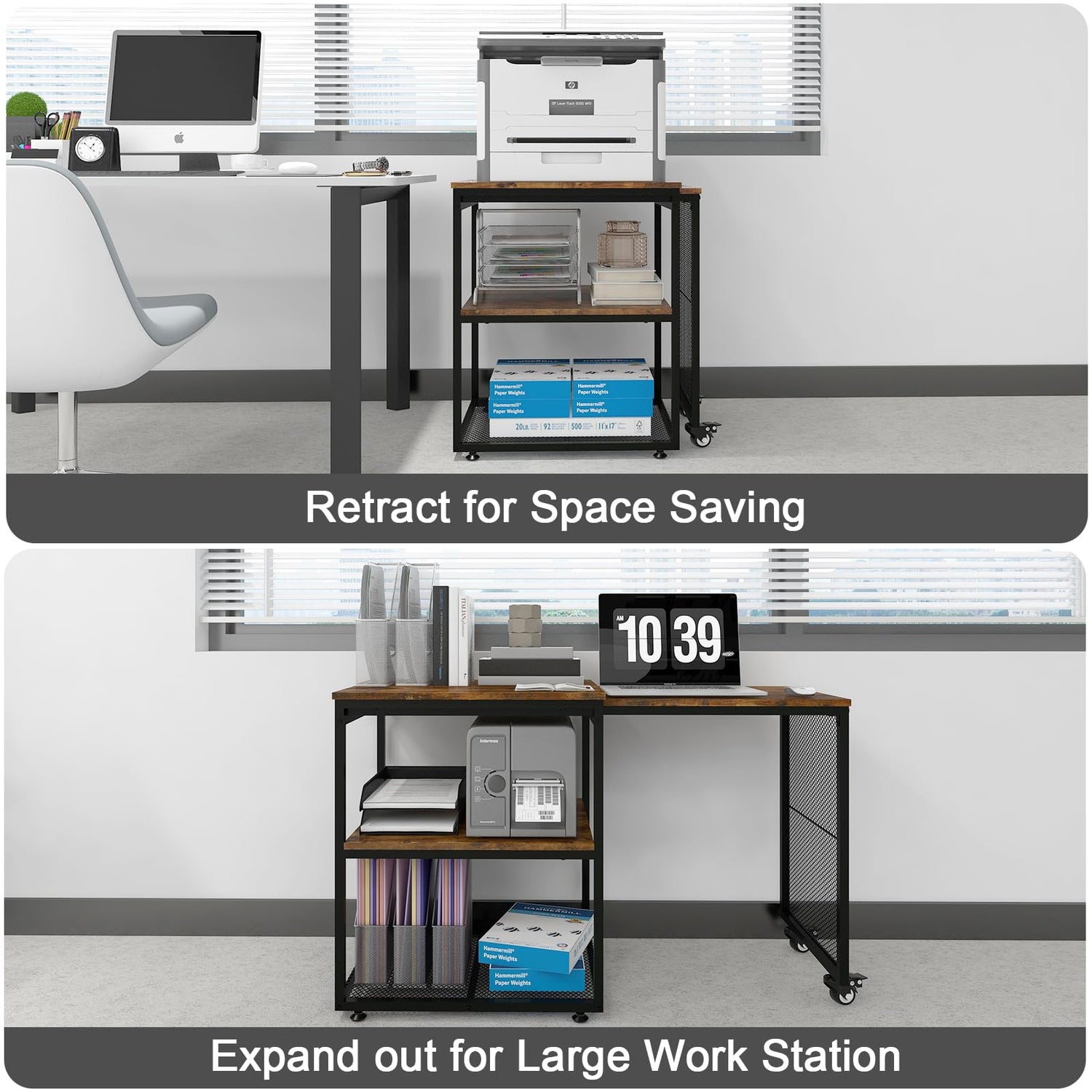 - 【Sturdy & Durable】The heavy duty printer stand is made of high-quality wood and metal frame, with excellent stability and durability, solid construction and long service life. This space saving table has 2 industrial grade swivel casters to move and extend table, all of them are equipped with brakes for stability.