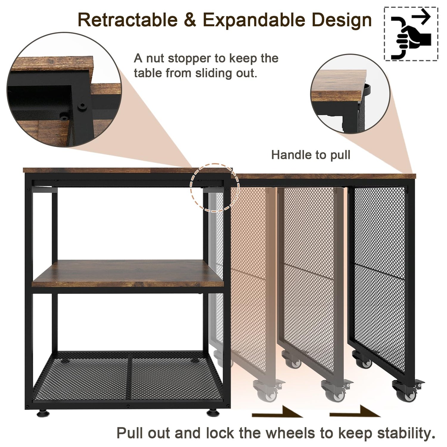 - 【Extendable Design with Handle】The versatile table is with a 3 tier storage shelf, and an extendable structure that can be stretched by handle. You can retract it to the innermost to save space, or pull it out and lock the wheel for stability to provide additional workspace, it will be perfect for you to put your laptop or do your craft work.