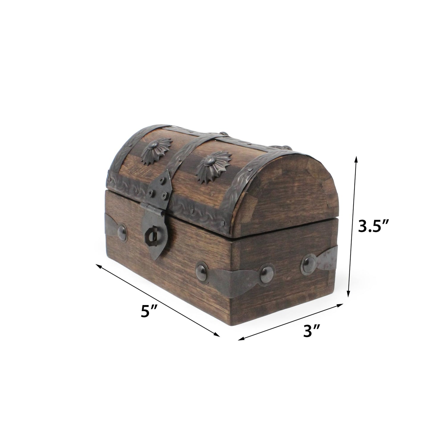 - Looks like an authentic Pirate Treasure Box in mini form! Made of quality mango wood and has decorative real iron plating and buttons. Wood finish color and measurements may vary slightly from piece to piece