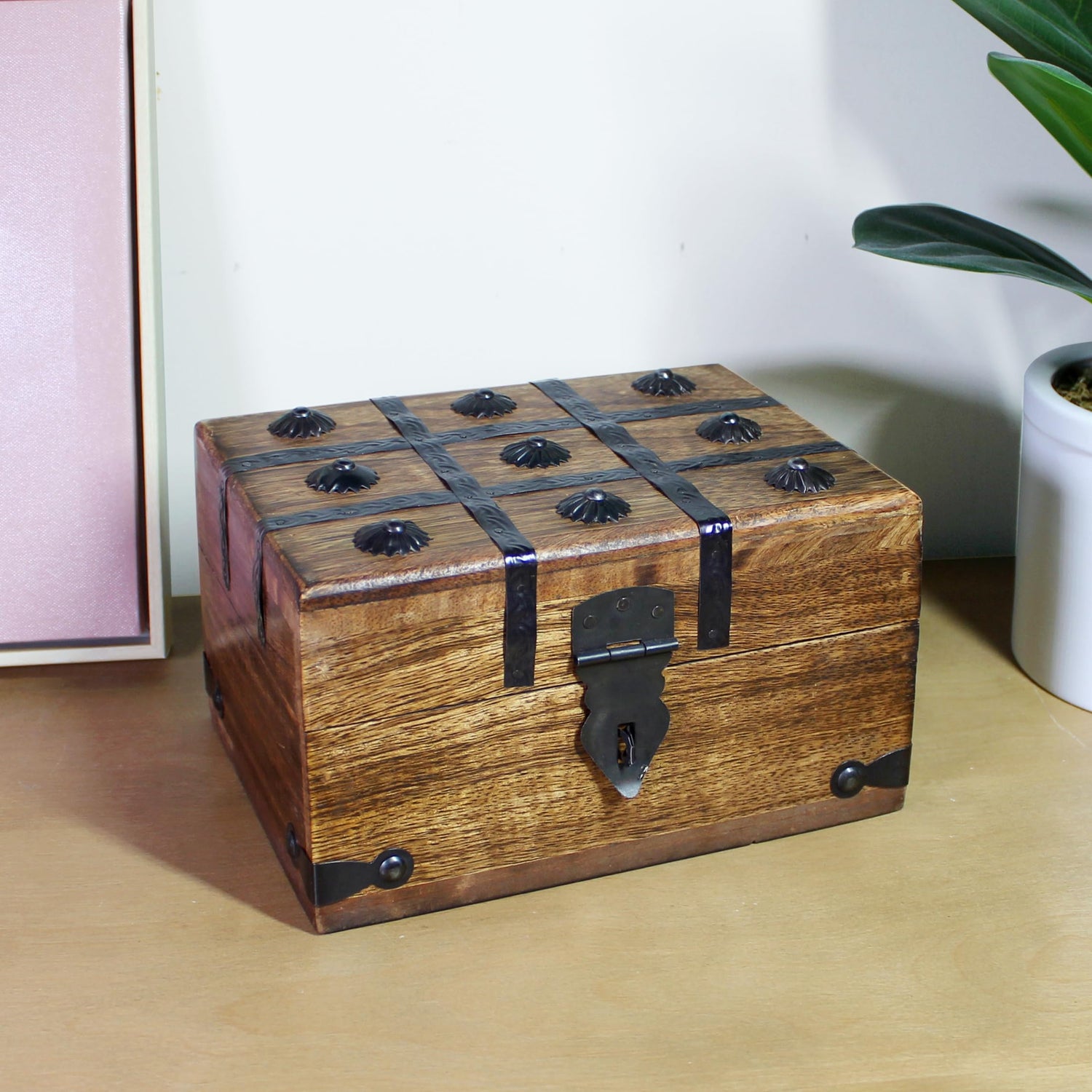 Nautical Cove Treasure Chest Wooden Box with Antique Iron Lock and Skeleton Key - Storage and Decor (Small 8 x 6 x 4.5)