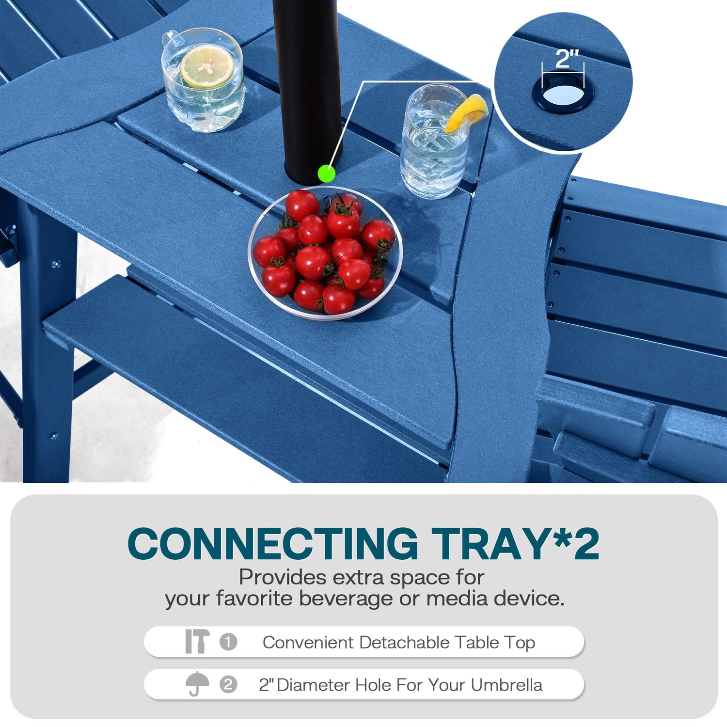 - 【Removable Tray with Umbrella Hole*2】Two removable connecting trays sit between the twin Adirondack Balcony Arms, providing plenty of space for your favorite beverage, fruit, snacks, or books. Holds up to 35 lbs. There is a 2-inch diameter hole in the center of the table top to hold an umbrella.