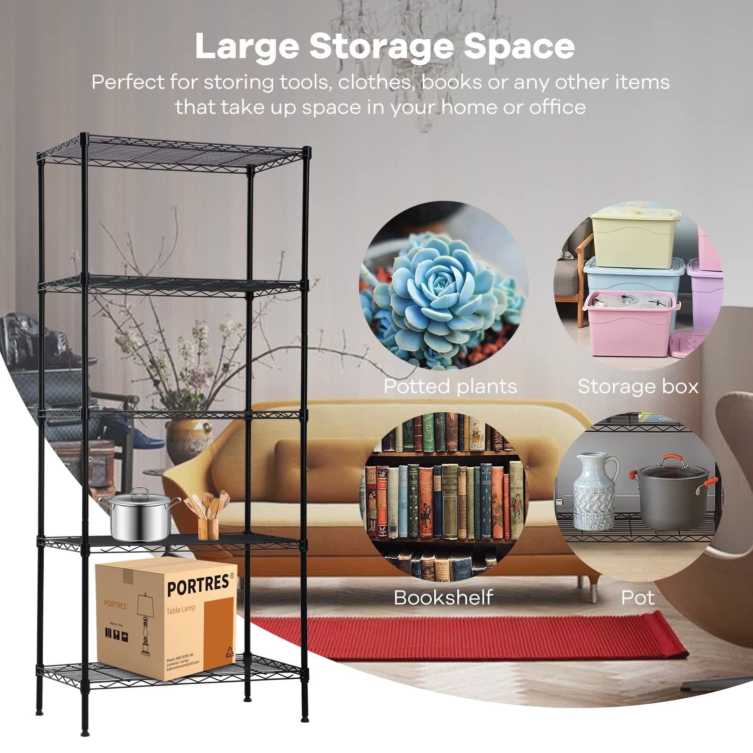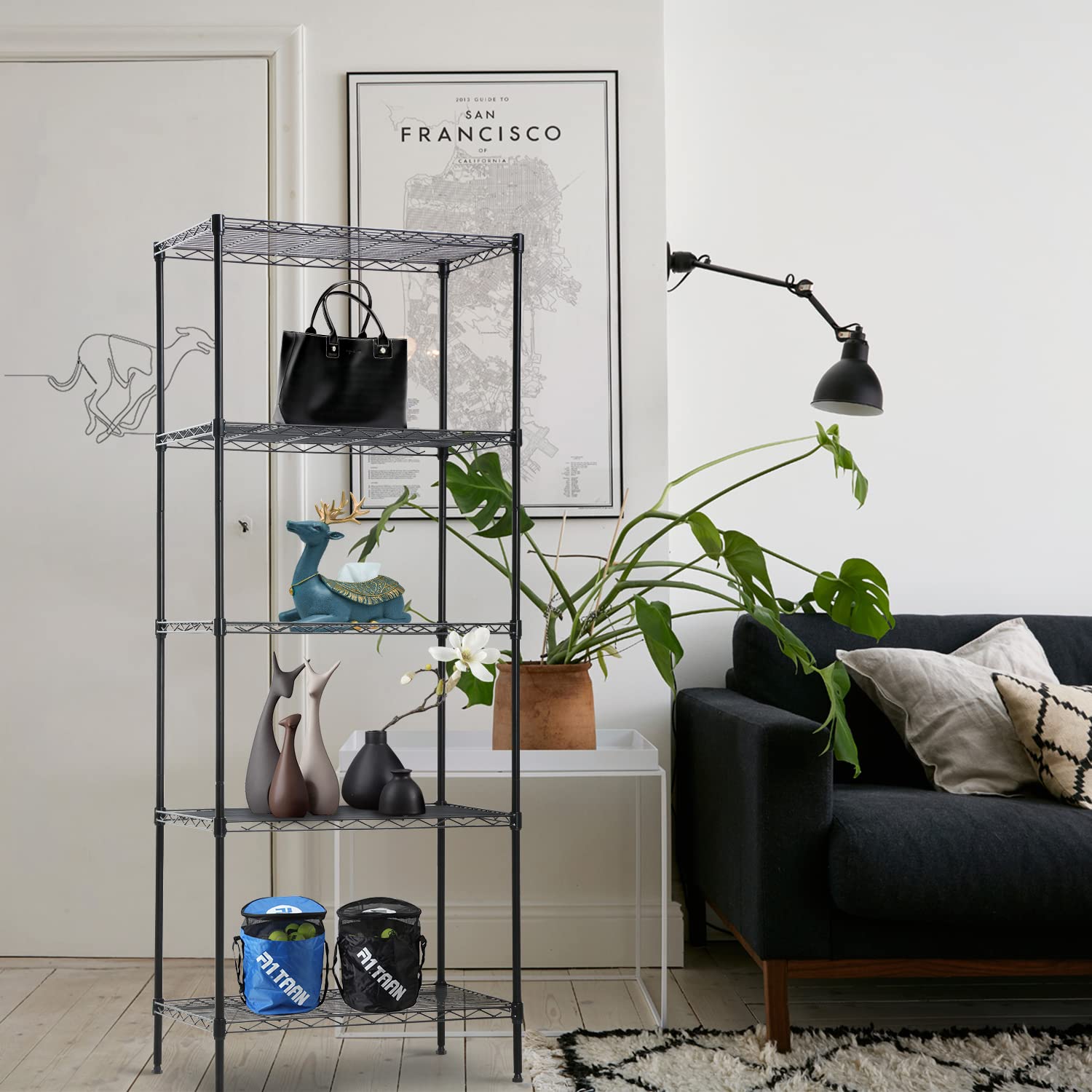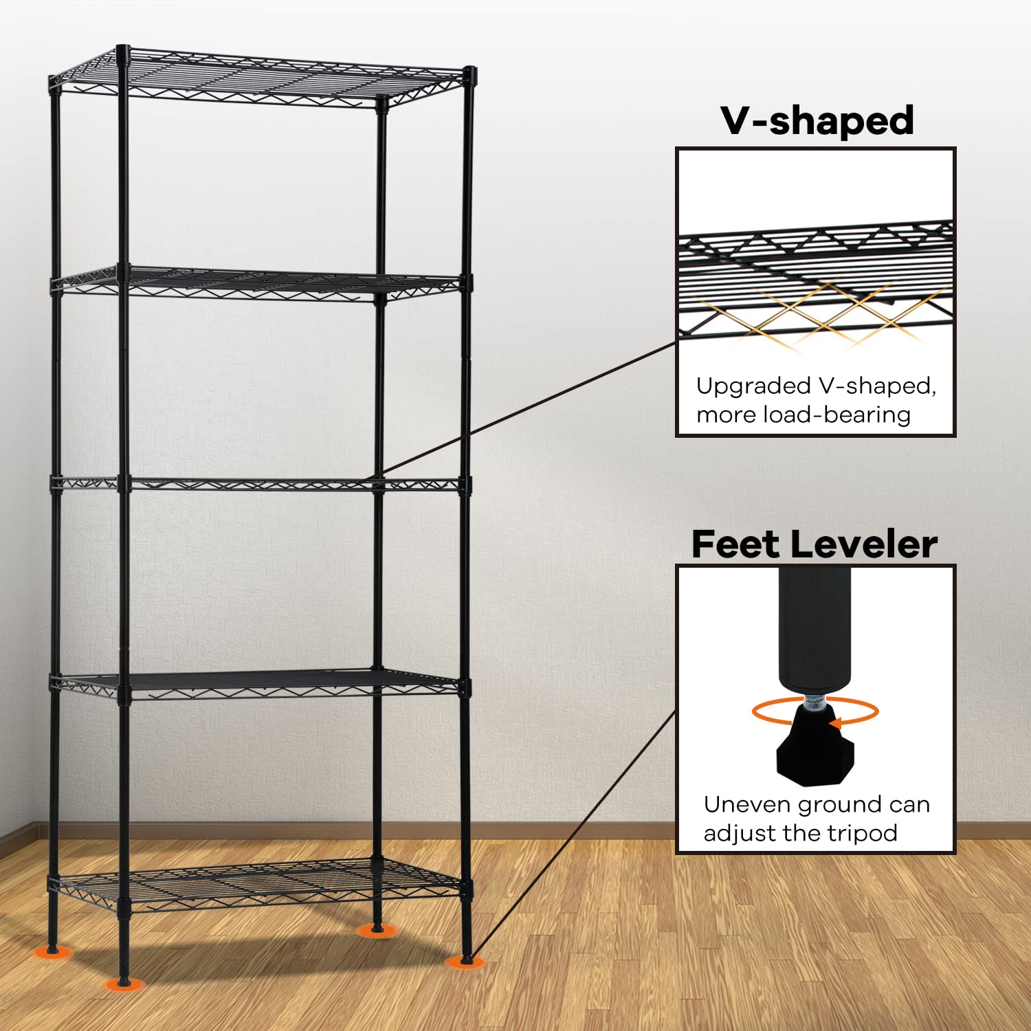 - 【Large Storage Space】This wire shelving unit comes with five level of shelves which can provide additional storage without taking up too much space in your home. Solve your shelving troubles, say goodbye to clutter, and meet the beauty of each day with a neat and tidy look.