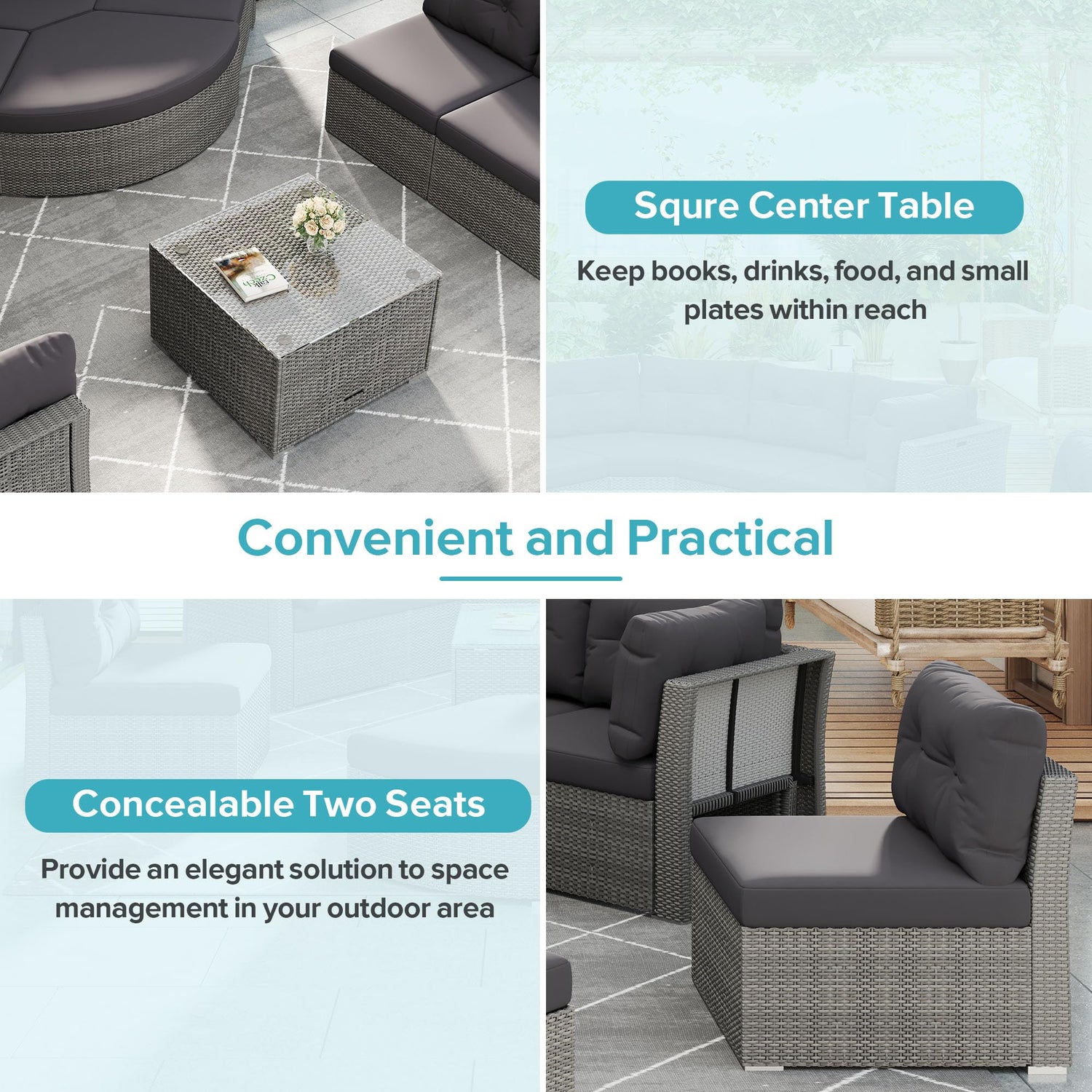- ✅ Half moon patio furniture set features space-saving concealable seating Ingenious hidden design adds 2 extra seats without sacrificing style Perfect for unexpected guests or maximizing compact areas Seats fold away neatly when not in use