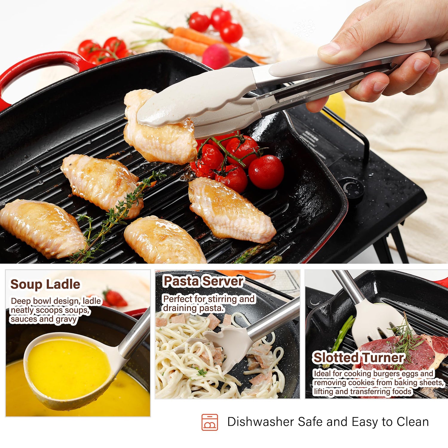 - LARGE STAINLESS STEEL HANDLES KITCHEN UTENSILS: Our kitchen utensils are designed in large sizes, not those ordinary kitchen utensils that look like toys. Silicone heads combined with high quality stainless steel handles ensure lightweight and durable. The thickened anti-scald silicone cover on the handle prevents slipping and also prevents the cook's hand from getting burned. Strong welding makes the silicone head durable and hard to come off even after long time use