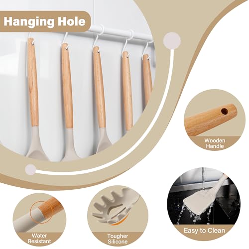 NCUE Kitchen Utensils Set with Holder, 26 pcs BPA Free Non-stick, Wooden Handle Heat Resistance Silicone Spatula Spoon Kitchen Gadgets Cooking Utensils Set (Khaki)