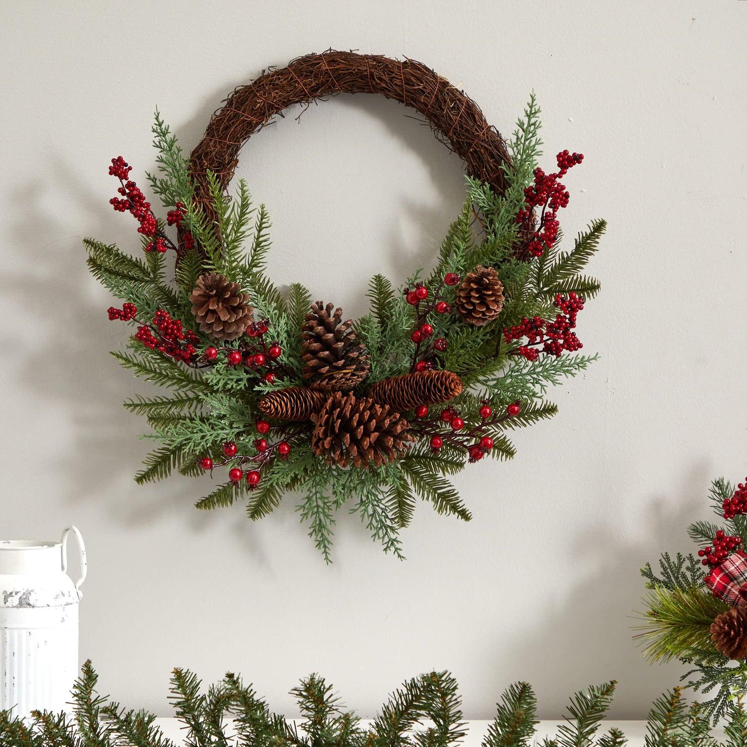 - Highlight your home with this artificial wreath made from year-round evergreens and mixed pine foliage, highlighted with realistic pinecones and bright red holly berries. Evoking the holiday spirit, this Silk wreath measures 22in. Around.