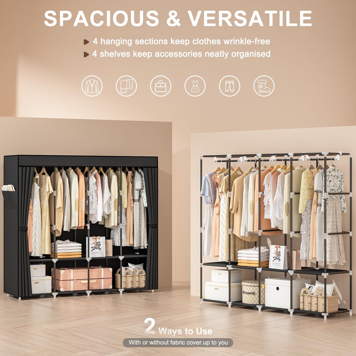 Neatrays Wardrobe Closet, 66 Inch Portable Closet for Hanging Clothes, Large Capacity Clothes Rack Organizer with Cover & 4 Hanging Rods & 8 Storage Shelves & 2 Side Pockets (Black)