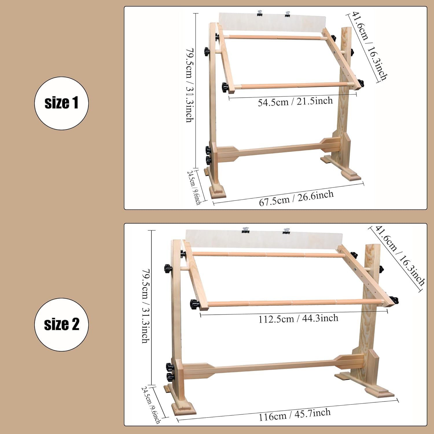 - This product can be assembled into 2 Adjustable Embroidery Stands with dimensions of (54.5x41.6 cm (21.5“ x 16.3”)) and (112.5x41.6 cm (44.3“ x 16.3”)).
