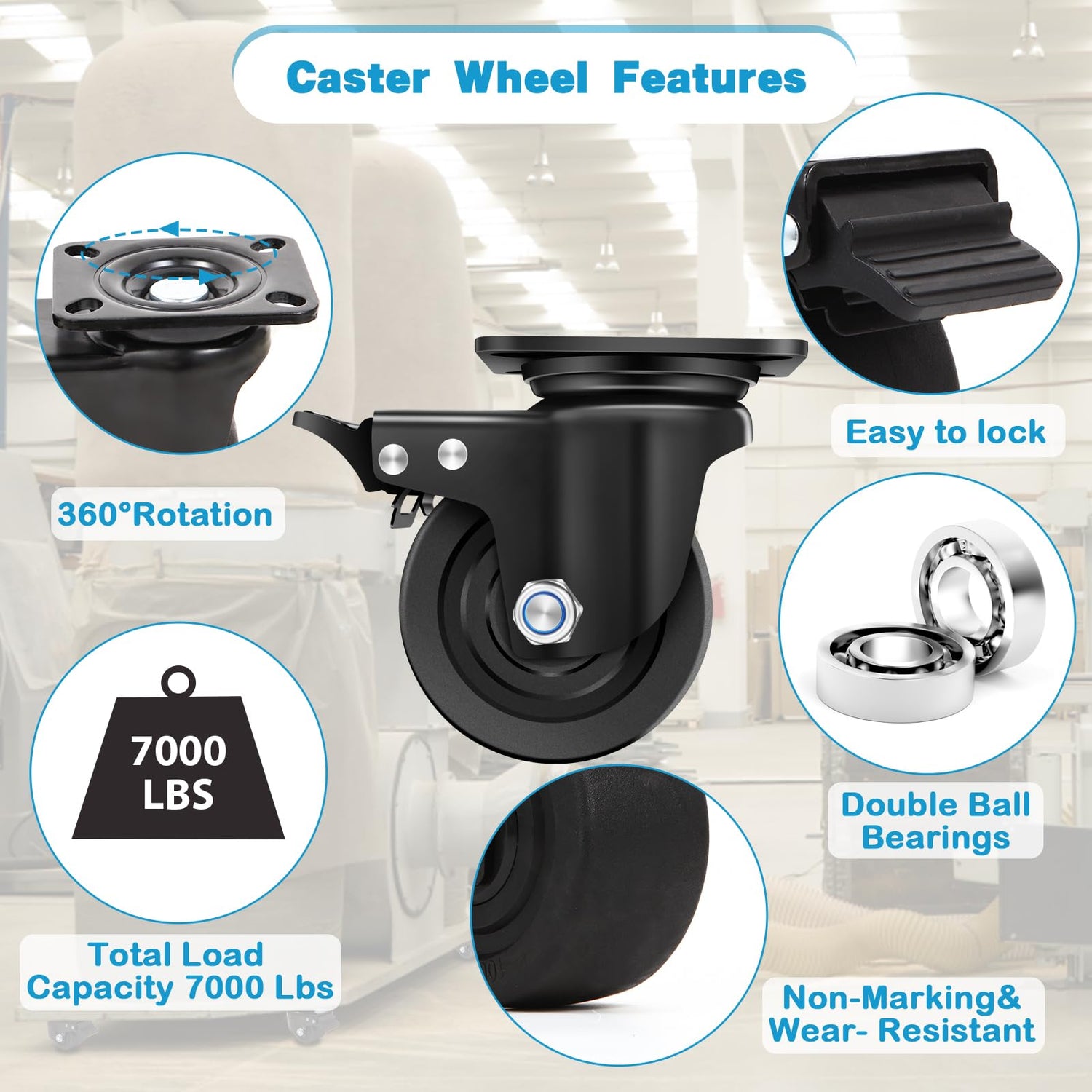 - Improved Stability: One of the primary benefits of 4 inch heavy duty caster wheels is improved stability for equipment. The industrial caster’s low profile design and high-quality materials have amazing 7000 lbs load capacity to ensure that the equipment remains stable and does not tip over during movement