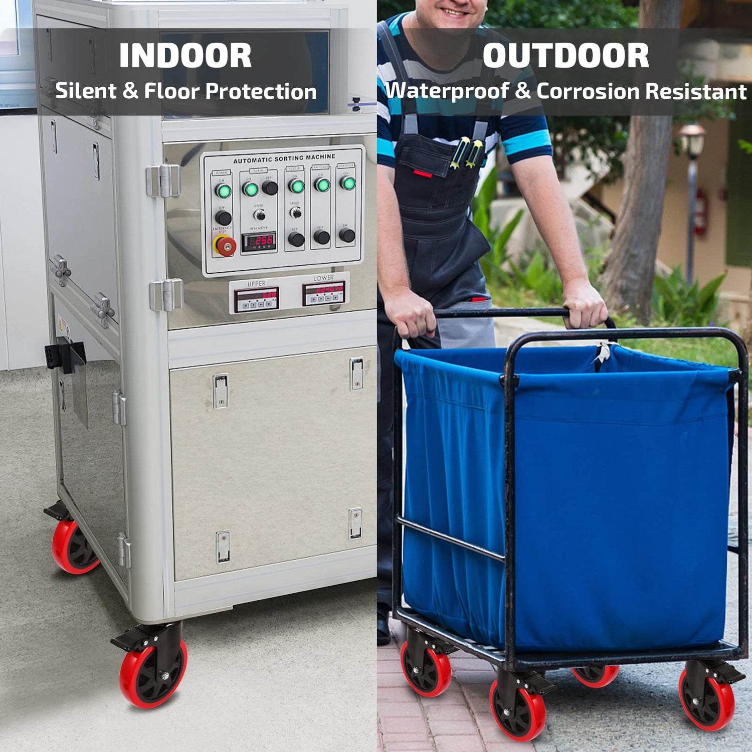 - 【Double Safety Brake & Ball Bearing】The 6 inches industrial grade caster wheels are equipped with double ball sealed bearings, which reduce friction and increase their speed limit, making them easier to move. They are capable of rotating 360 degrees, and each swivel caster has its own brake that can lock both the wheel and the swivel at the same time, which helps prevent the devices from moving and causing harm to others.