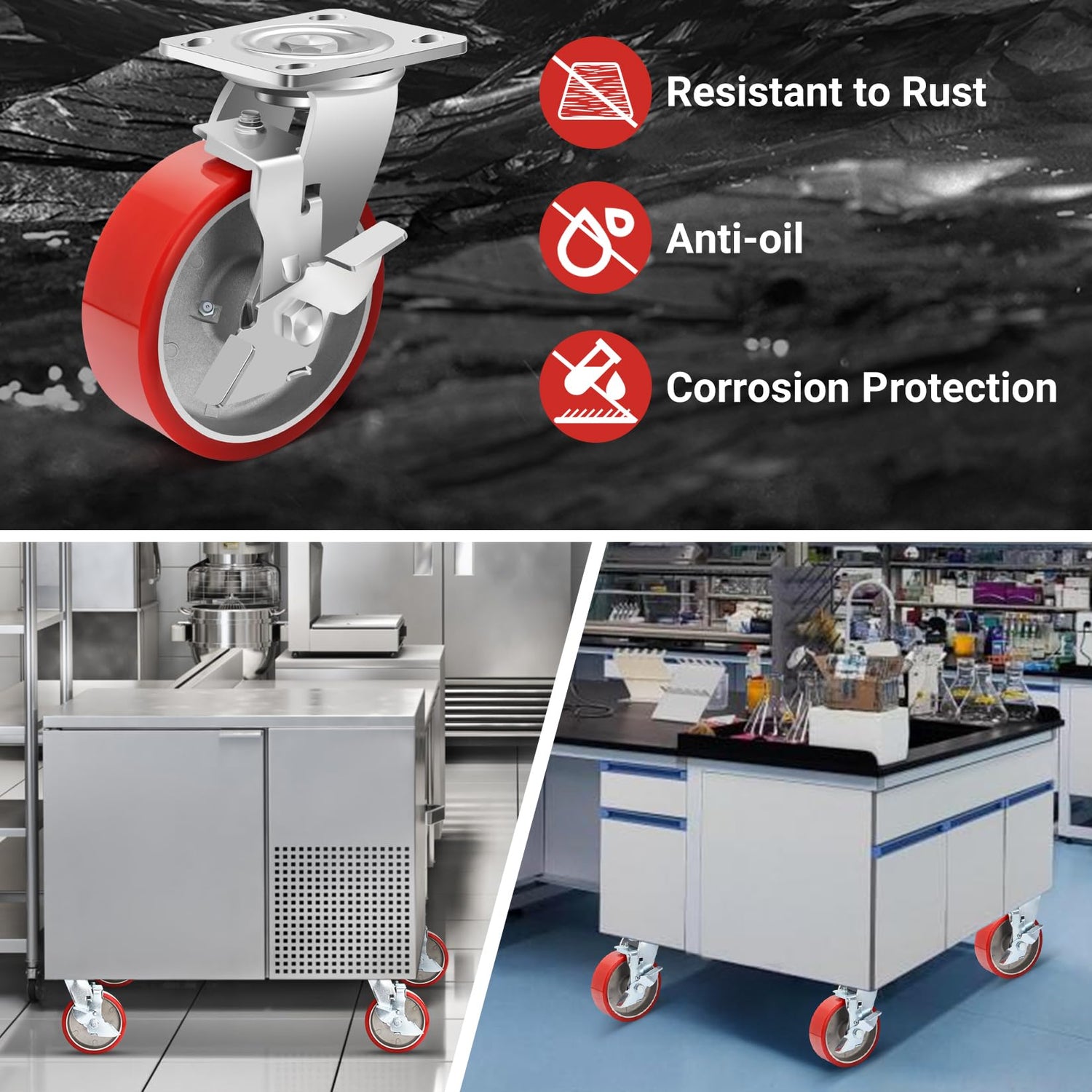 Nefish 6 Inch Heavy Duty Industrial Grade Casters Wheels, Aluminum Core PU Castor Set of 4, Durable Plate Swivel Casters with Brake 5000 LBS, Anti-Corrosion Wheels for Industrial, Equipment