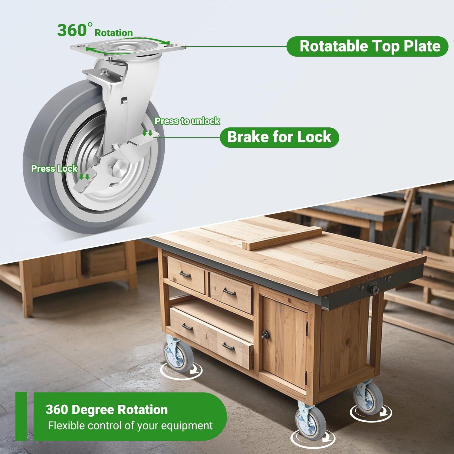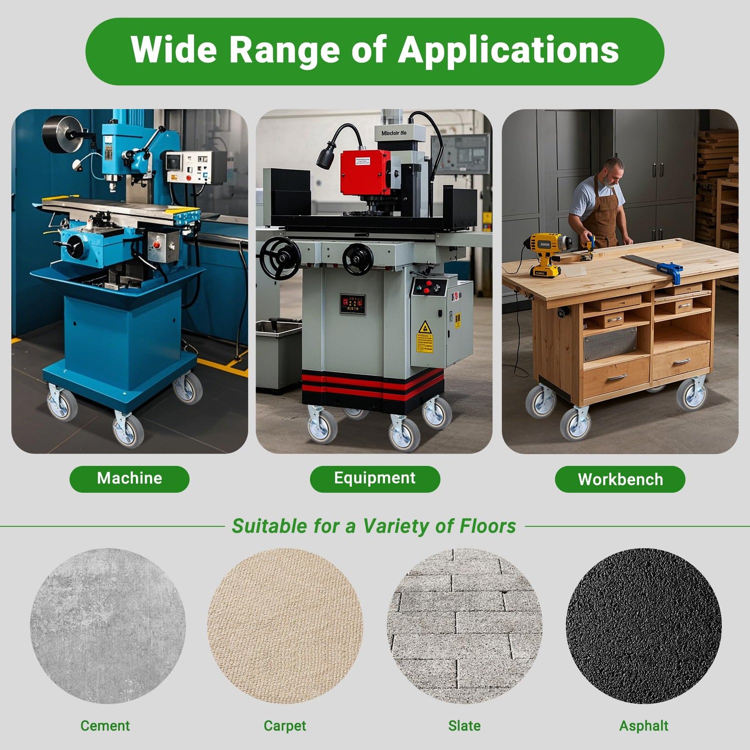 - Versatile Applications: These heavy-duty casters set of 4 adapt seamlessly to diverse environments such as warehouses, retail, medical, and industrial settings. They’re ideal for heavy shelving units, material handling equipment, and janitorial carts, providing reliable mobility and support.