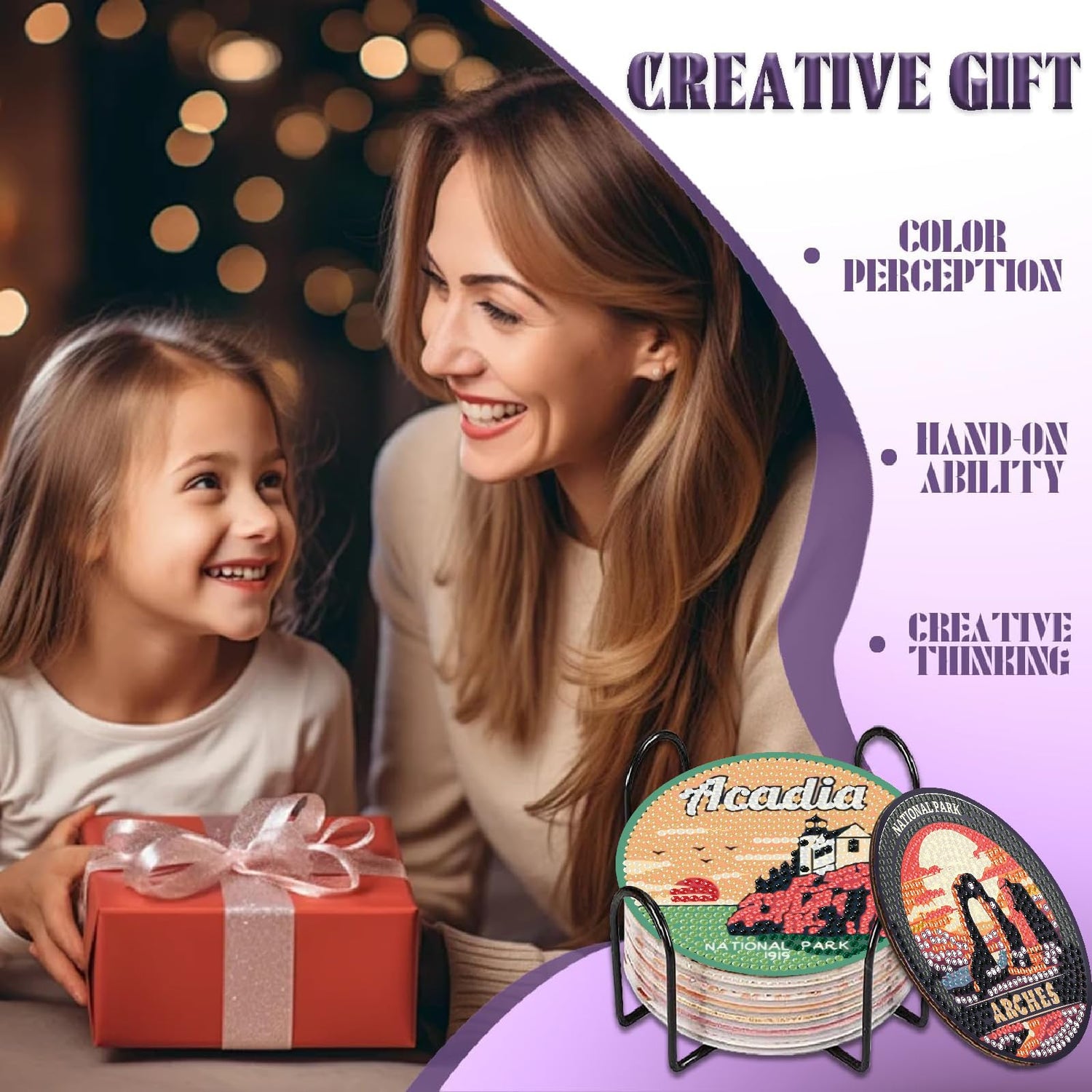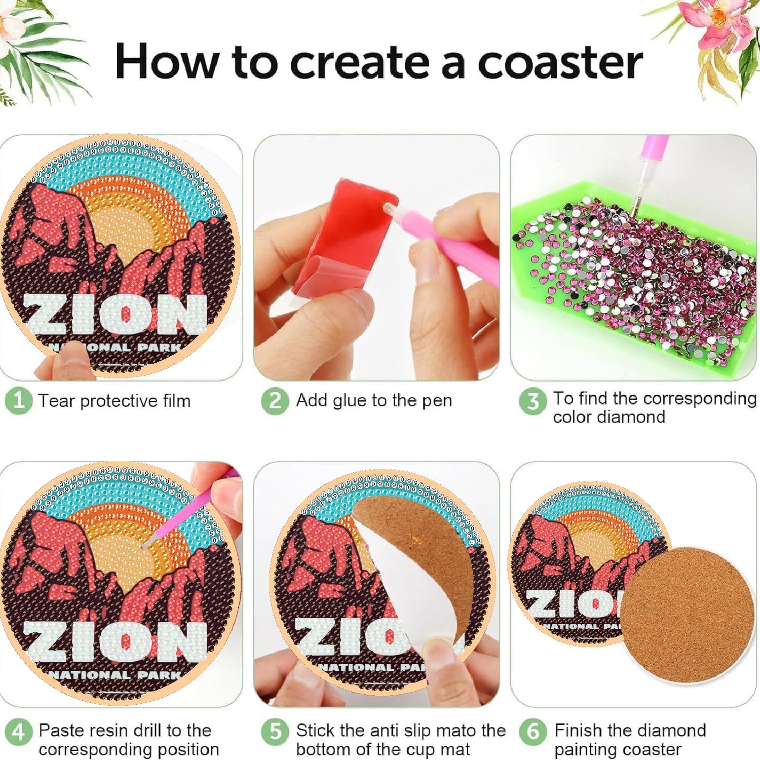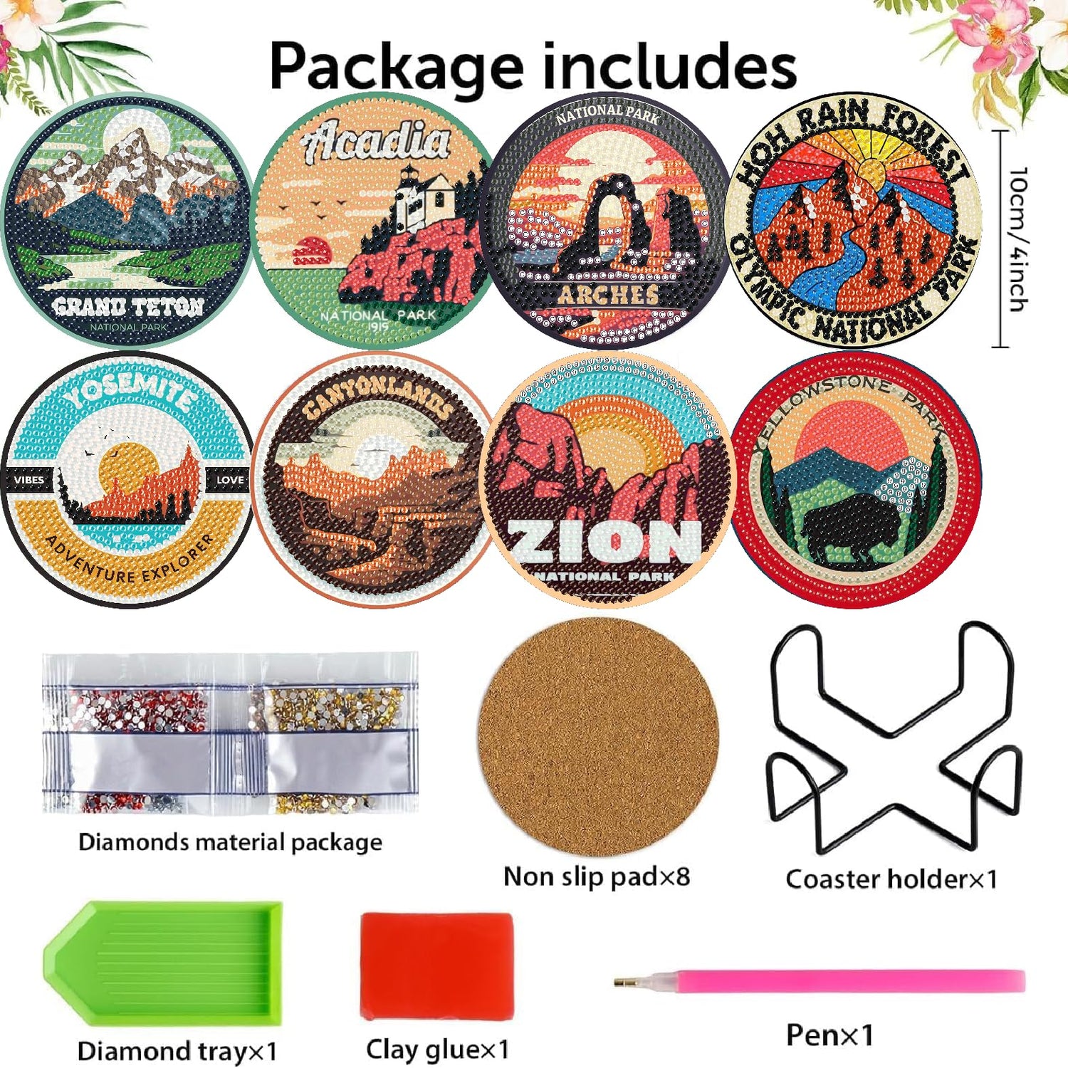 - 【5D Diamond Painting Kits】Each diamond paintings comes with all tools in need.Package Included:8 diamond art coasters, 8 adhesive cork bases, 1 coaster holder, 1 label, 1 diamond pens, 1 mini clay glues, 1 trays