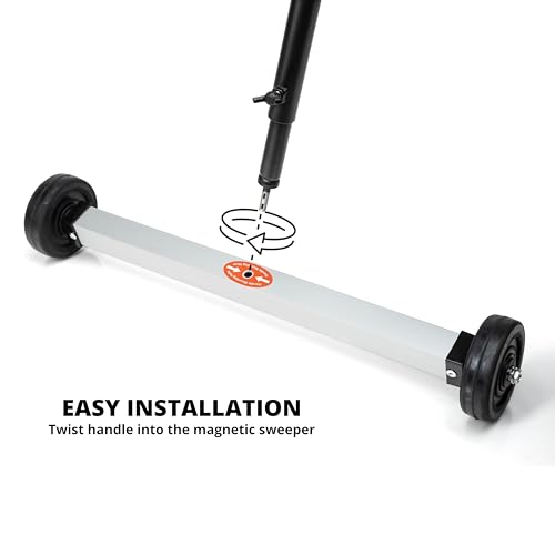 Details: Introducing the NEIKO 53414A the ultimate solution for efficient and safe cleanup in your workshop or garage – the Magnetic Sweeper. Designed with convenience and effectiveness in mind, this rolling magnet sweeper effortlessly retrieves nails, screws, and all ferrous metal objects from the floor, ensuring your safety from debris and sharp metals. With a remarkable load capacity of up to 4.5 pounds, this mini magnet is a powerhouse, clearing the entire area more quickly and efficiently with its 17" large working surface area. Thanks to its smooth roller wheels, measuring 3" and side-mounted, this shop magnet glides effortlessly on various surfaces including carpet, grass, concrete, and hardwood floors, making cleanup a breeze. The telescopic handle boasts an adjustable height from 17" to 40", preventing back bending and straining during use. Compact and efficient, this magnetic sweeper doubles as a pickup tool, perfect for fast cleanups of excess metal parts. Upgrade your workshop with the Magnetic Sweeper and experience unparalleled convenience and safety in your cleanup routine.