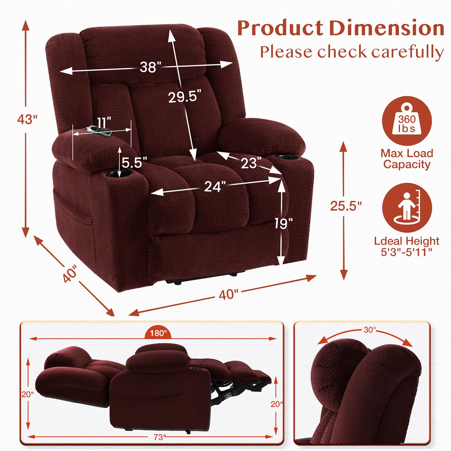 - Larger than Other Large Recliners: Our lift chairs suitable for 5'4” to 6'1”, this power recliner offers an extended footrest to fully support your legs and prevent dangling. The large wide spacious 23"x24" seat cushion provides ample space and exceptional comfort