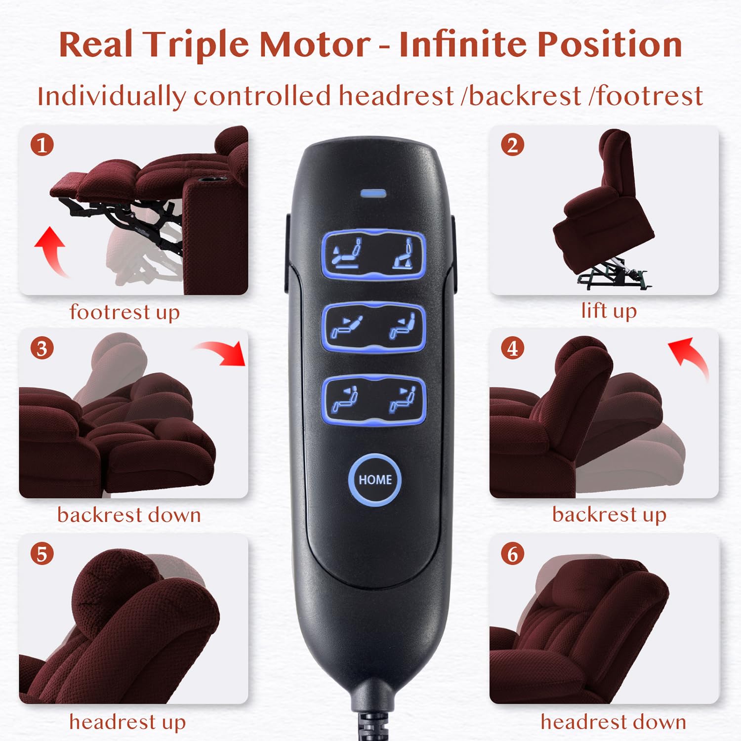 - 3 Motor 180° Lay Flat Infinite Position: power lift recliner chair can independently adjust the headrest, backrest, and footrest for infinite comfort options, from 45° lift to 180° flat. Ideal for reading, watching TV, or sleeping, perfect for all your needs