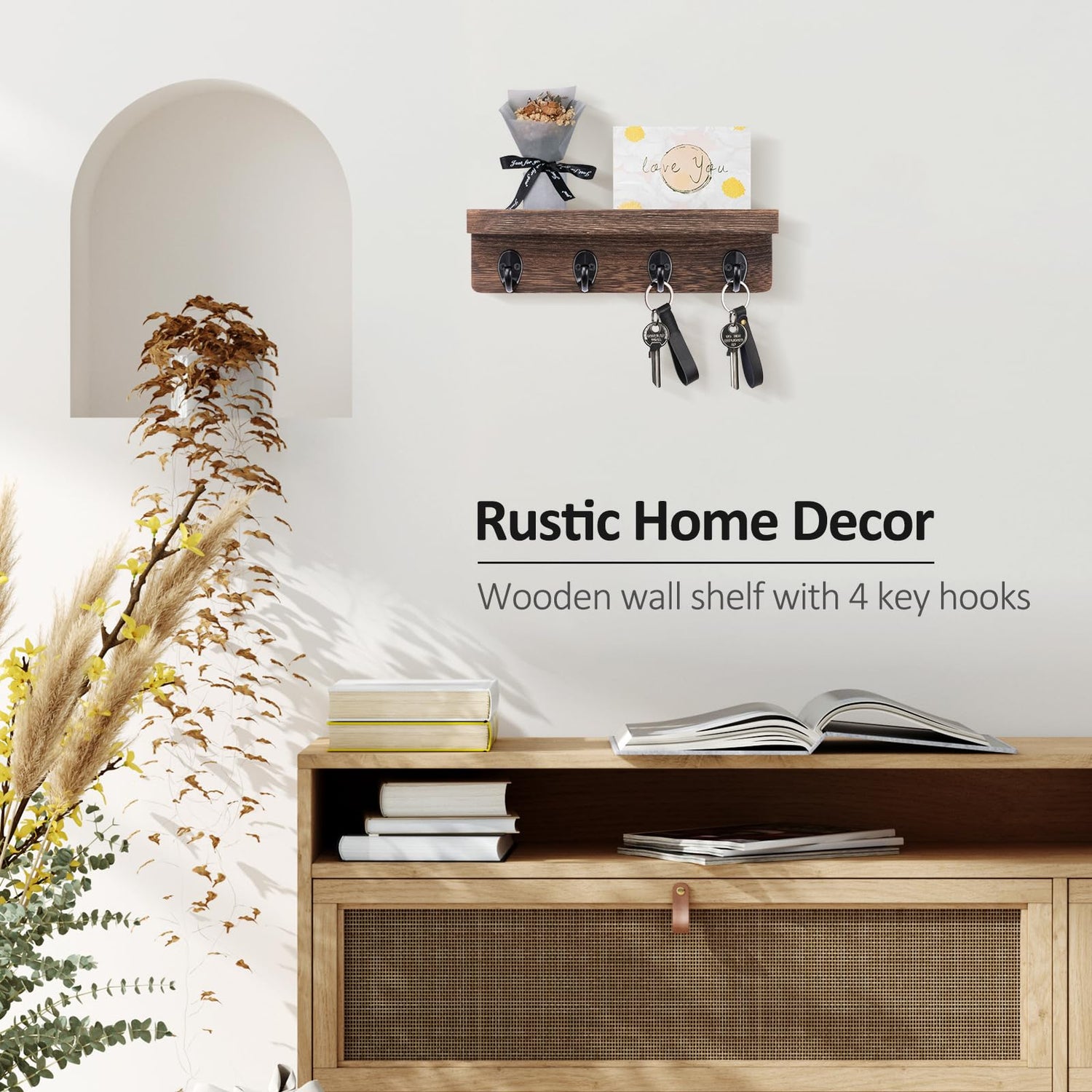 • DECORATIVE FUNCTIONALITY. This wooden key holder is designed with 4 key hooks and a display shelf. This allows you to personalize the key holder to fit your specific storage needs and aesthetic preferences, further enhancing its decorative appeal.