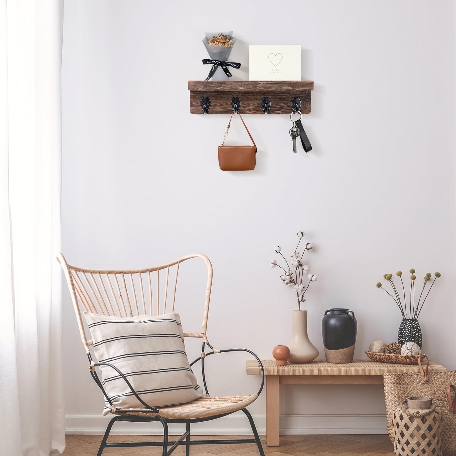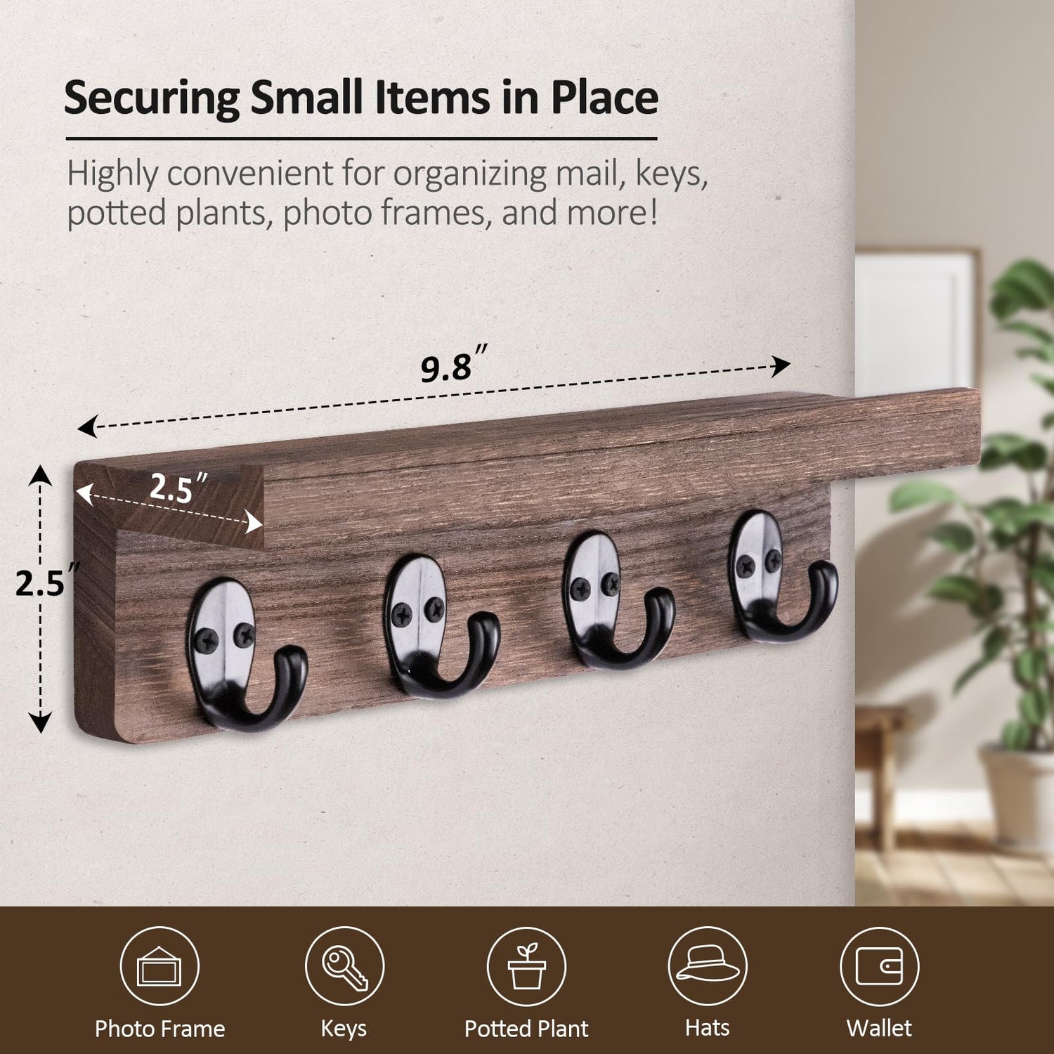 • KEEP YOUR KEYS ORGANIZED. Having a shelf integrated into the key holder means you can conveniently place items like letters, bills, or small personal belongings such as sunglasses or wallets alongside your keys. This helps you keep these items organized and easily accessible.