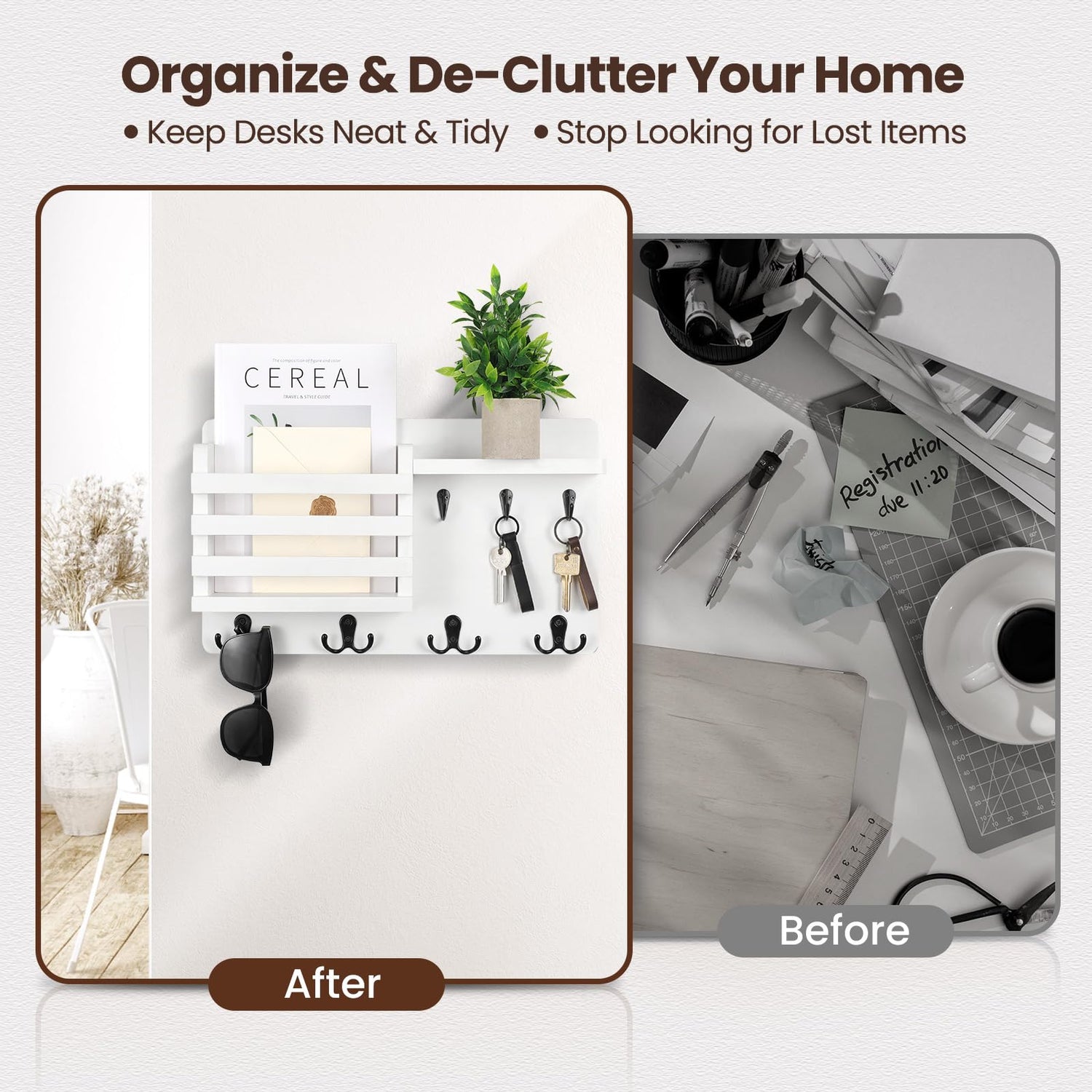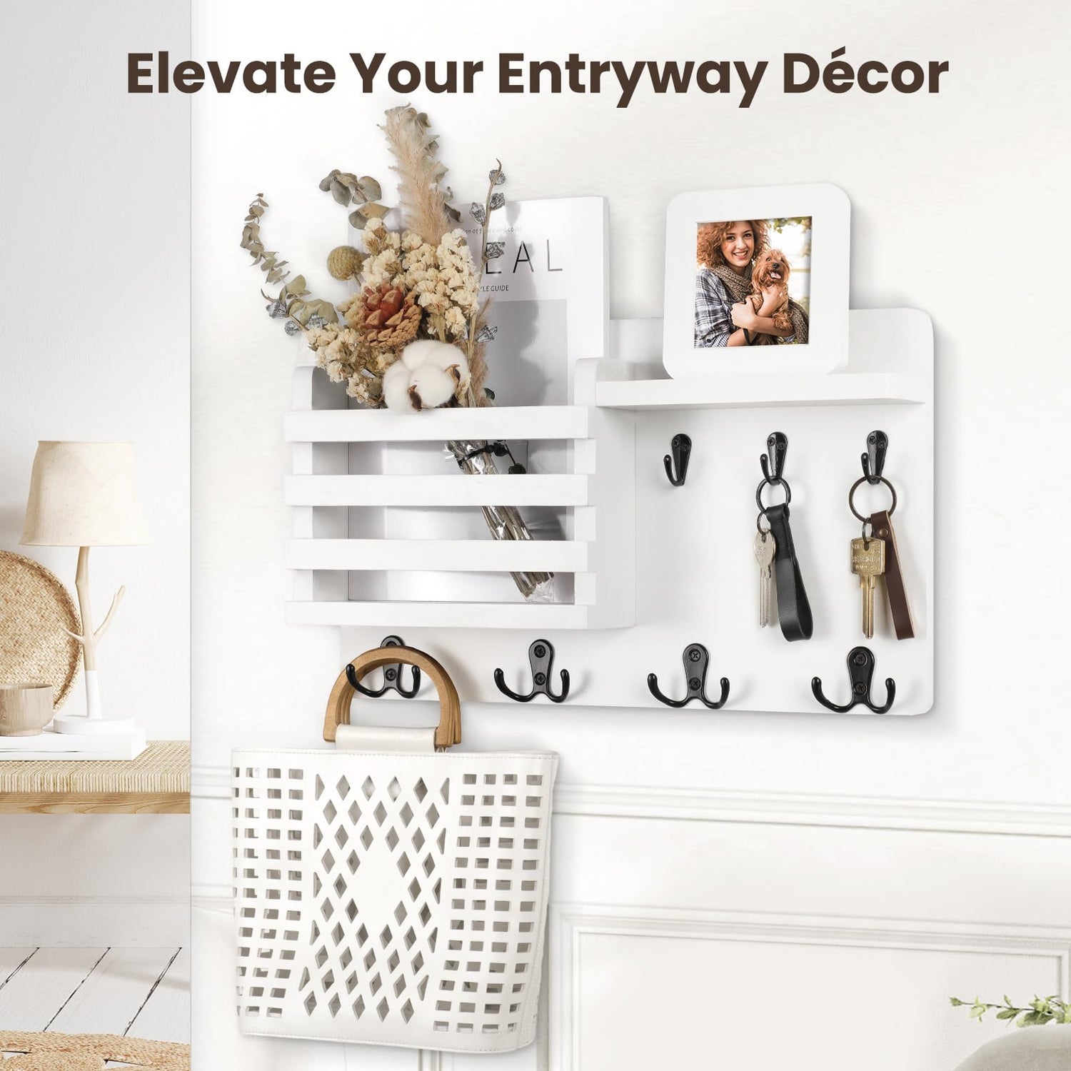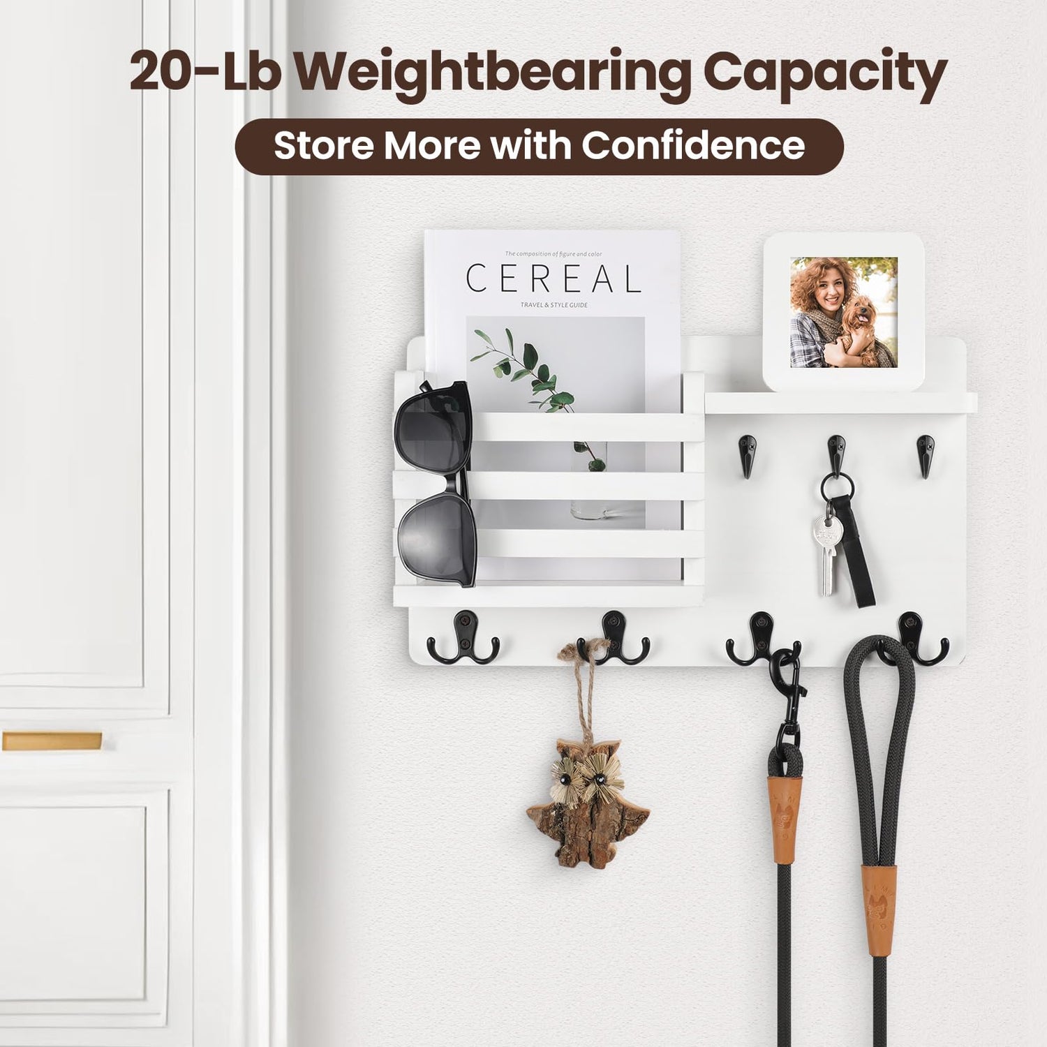 - DECORATIVE MAIL HOLDER with key hooks and coat hooks helps get your family out the door quickly to work and school. A handy place for leashes, ID lanyards, hats and sunglasses, it also has a floating shelf for knick-knacks.