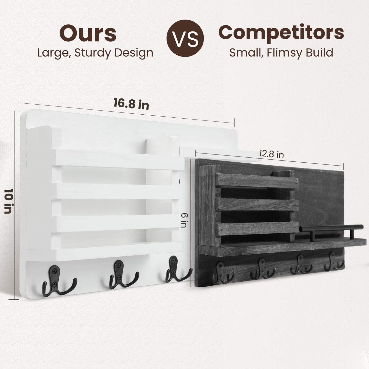 Keep track of incoming and outgoing mail while corralling often-used keys, caps, glasses and leashes with the Nekon Wall Mail Organizer. This stylish farmhouse mail organizer for wall is made of genuine wood for greater strength and rich, natural wood grain beauty. It holds many of the daily necessities that your spouse and children use for work, school and play. Mounted in your foyer, mudroom or kitchen, it helps instill daily habits for correspondence and deters frantic last-minute searches for house keys and car fobs.