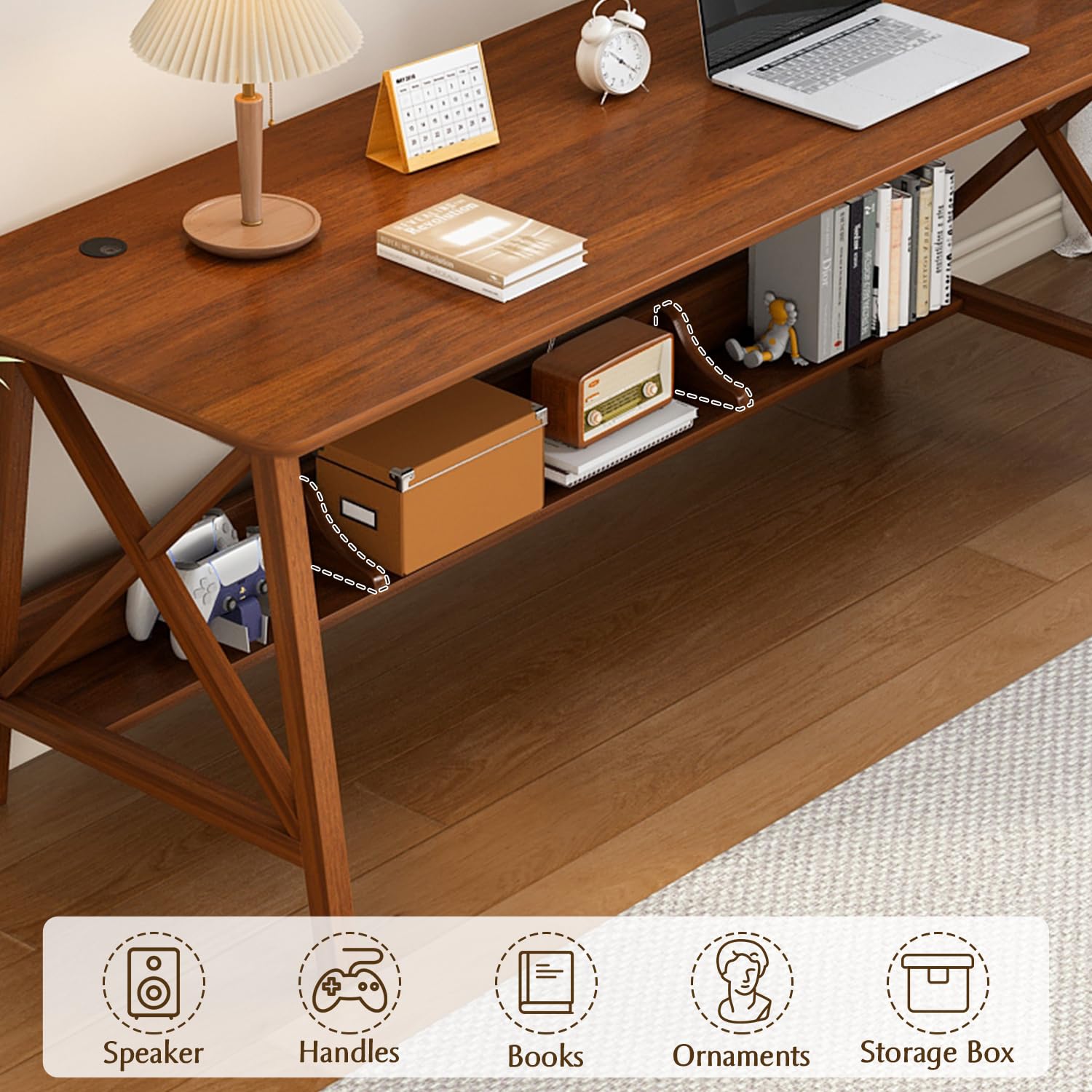 Extra Long NELYE Solid Wood Desk with Bookshelf - 2-Person Workstation in Walnut