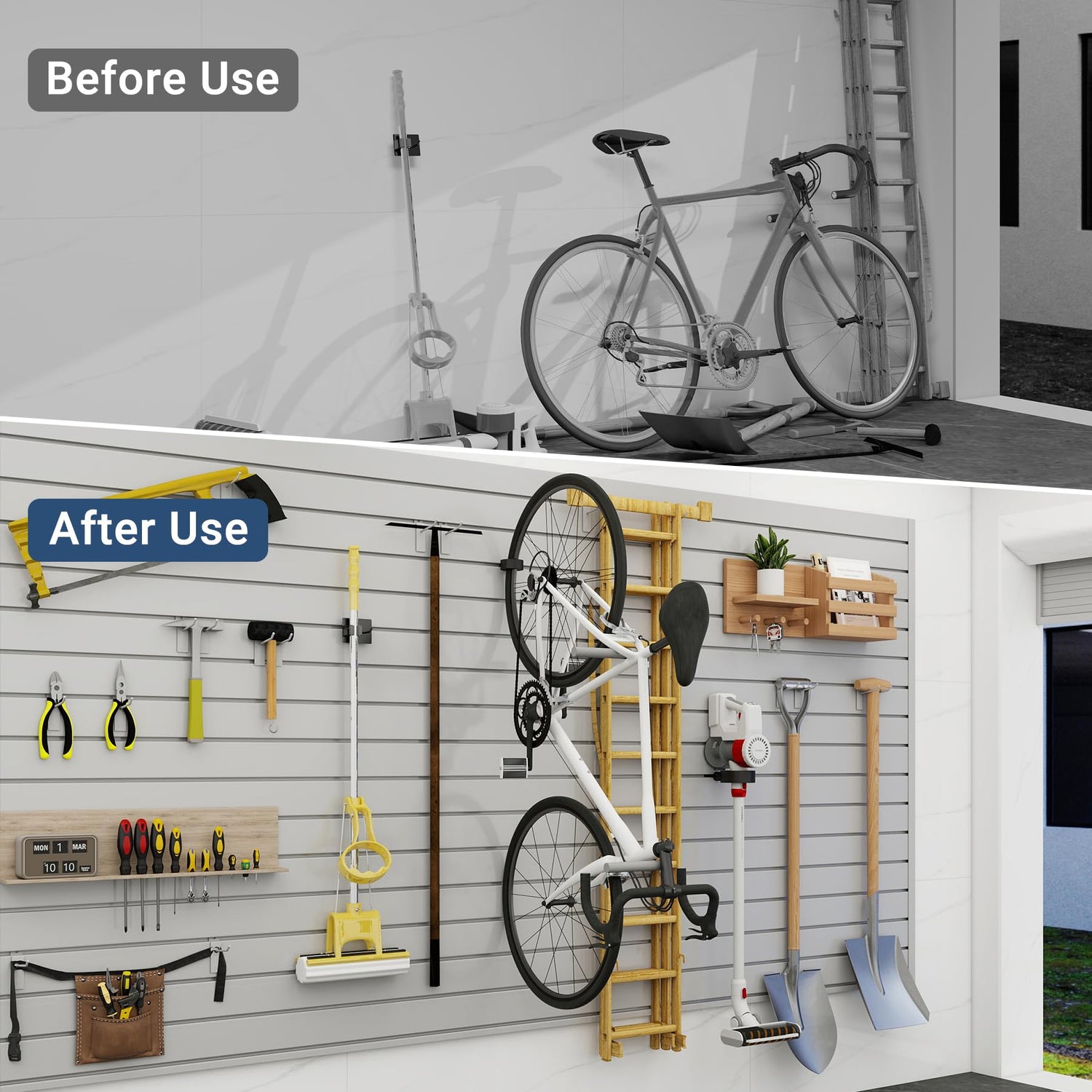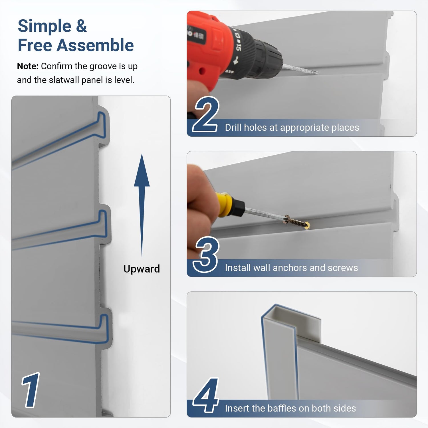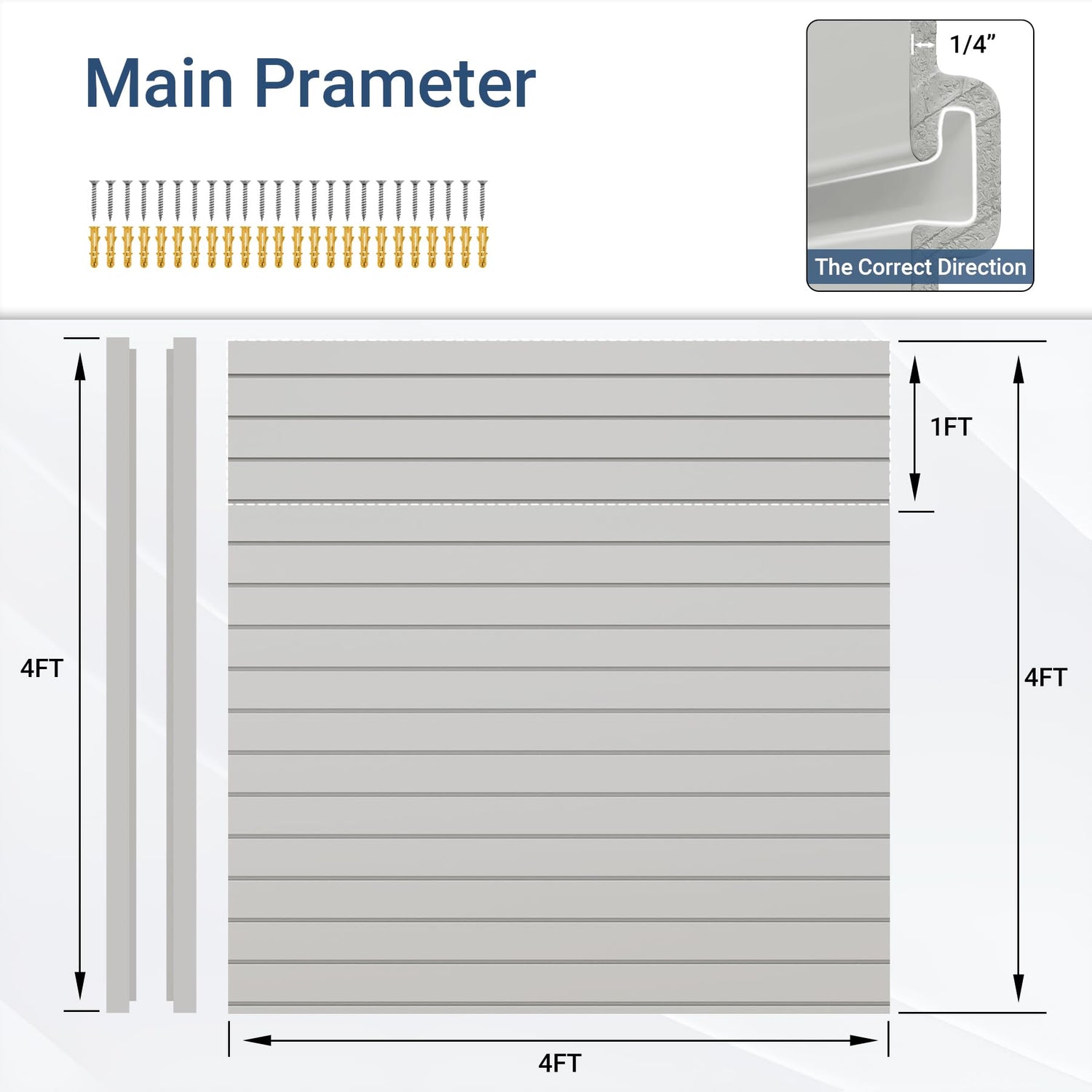 - Simple and Free Assembly: Our garage slat wall storage system includes 4PCS 4ft x 1ft slatwall panels; You can easily and independently complete the installation without difficulty(Note: Hook Not Included)