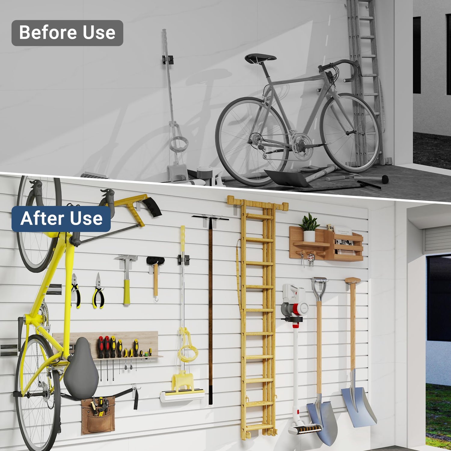 - Simple and Free Assembly: Our garage slat wall storage system includes 4PCS 4ft x 1ft slatwall panels; You can easily and independently complete the installation without difficulty(Note: Hook Not Included)
