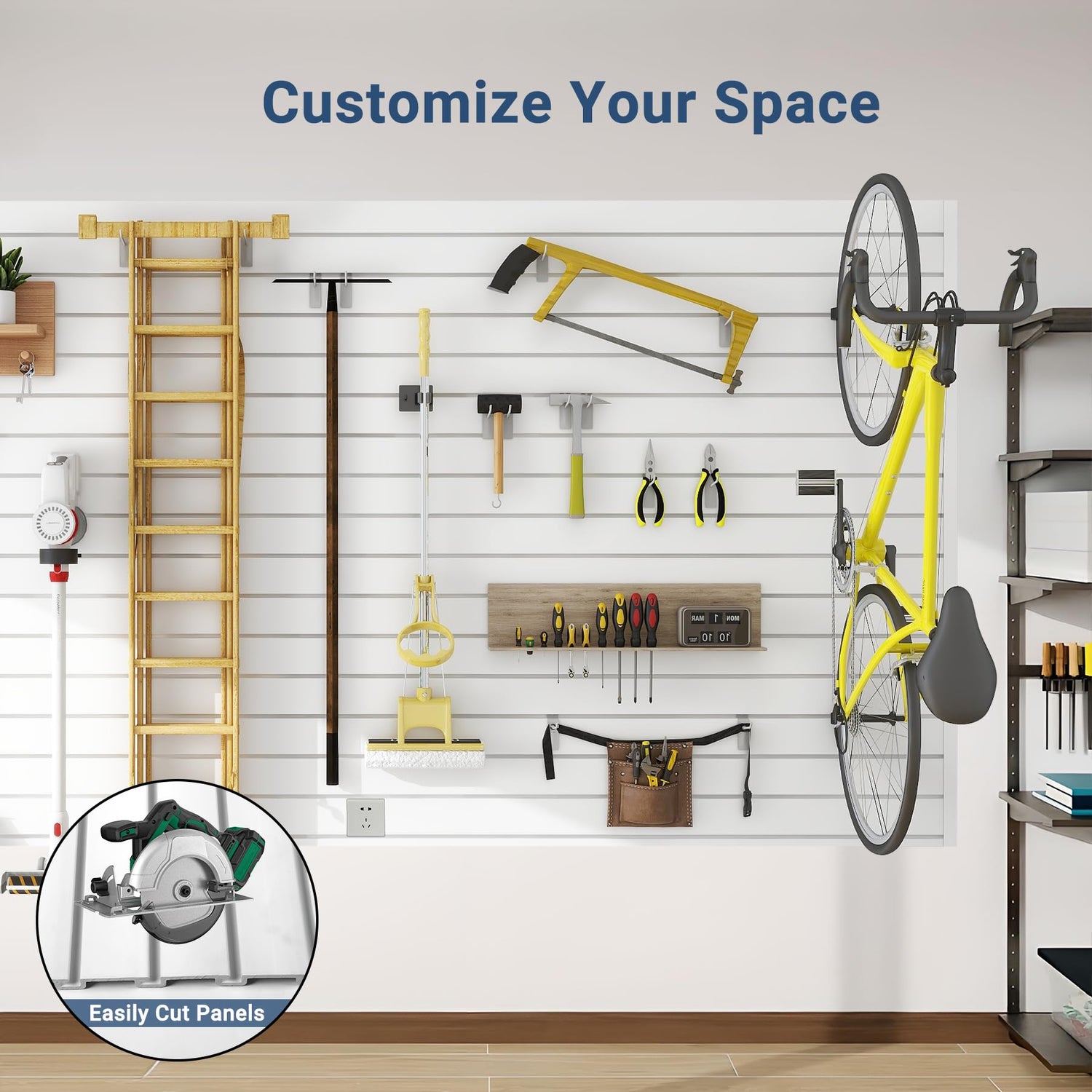 - Customize Your Space: You can easily cut the slatwall garage rack storage organization to any desired size or combined into larger sections and use slatwall hooks, brackets, shelves, and baskets to organize and showcase items on your wall to create the space you've dreamed of