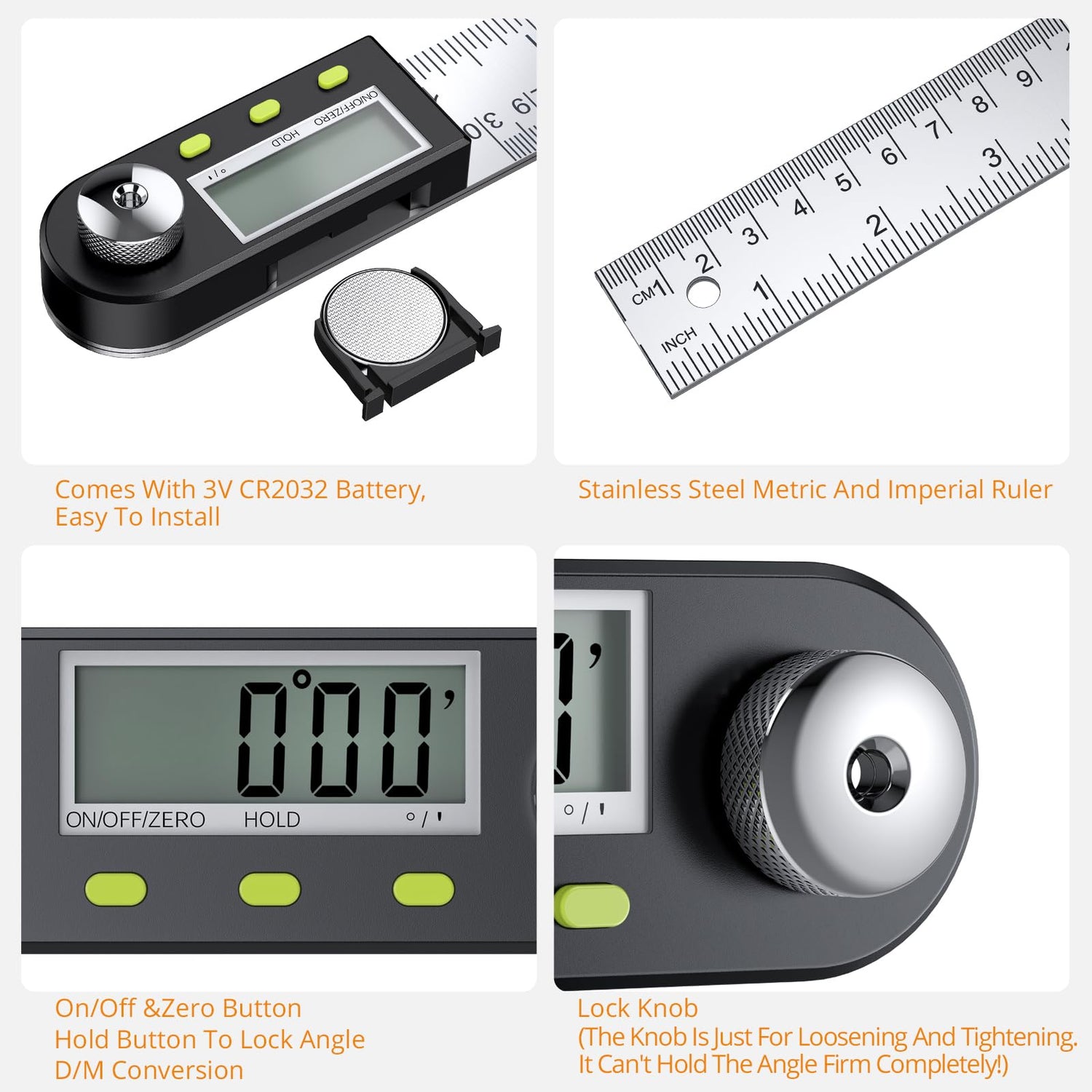 - 【Smart Angle Finder Ruler】Come with a 3V CR2032 Battery, Automatically Shut Down after 6 Minutes of Inactivity