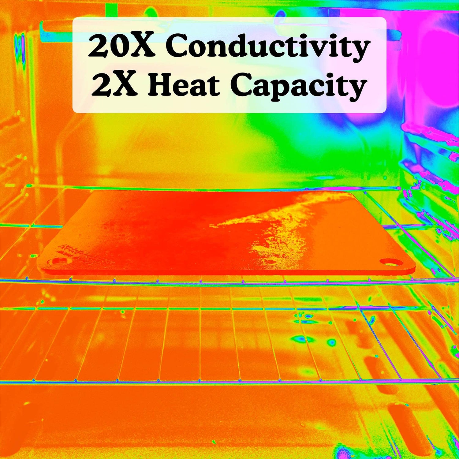 - 20x higher conductivity than ceramic baking stones and twice the heat capacity. This lets it send much more heat energy to your crust so you can get the great performance of a 1000F oven in a home oven at 450F.