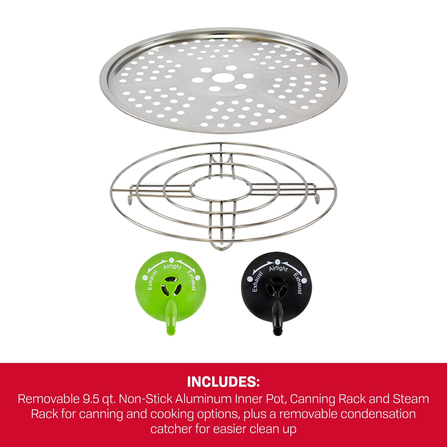 - INCLUDES: Canning rack and steam rack for canning and cooking options and a removable condensation catcher for easier clean up