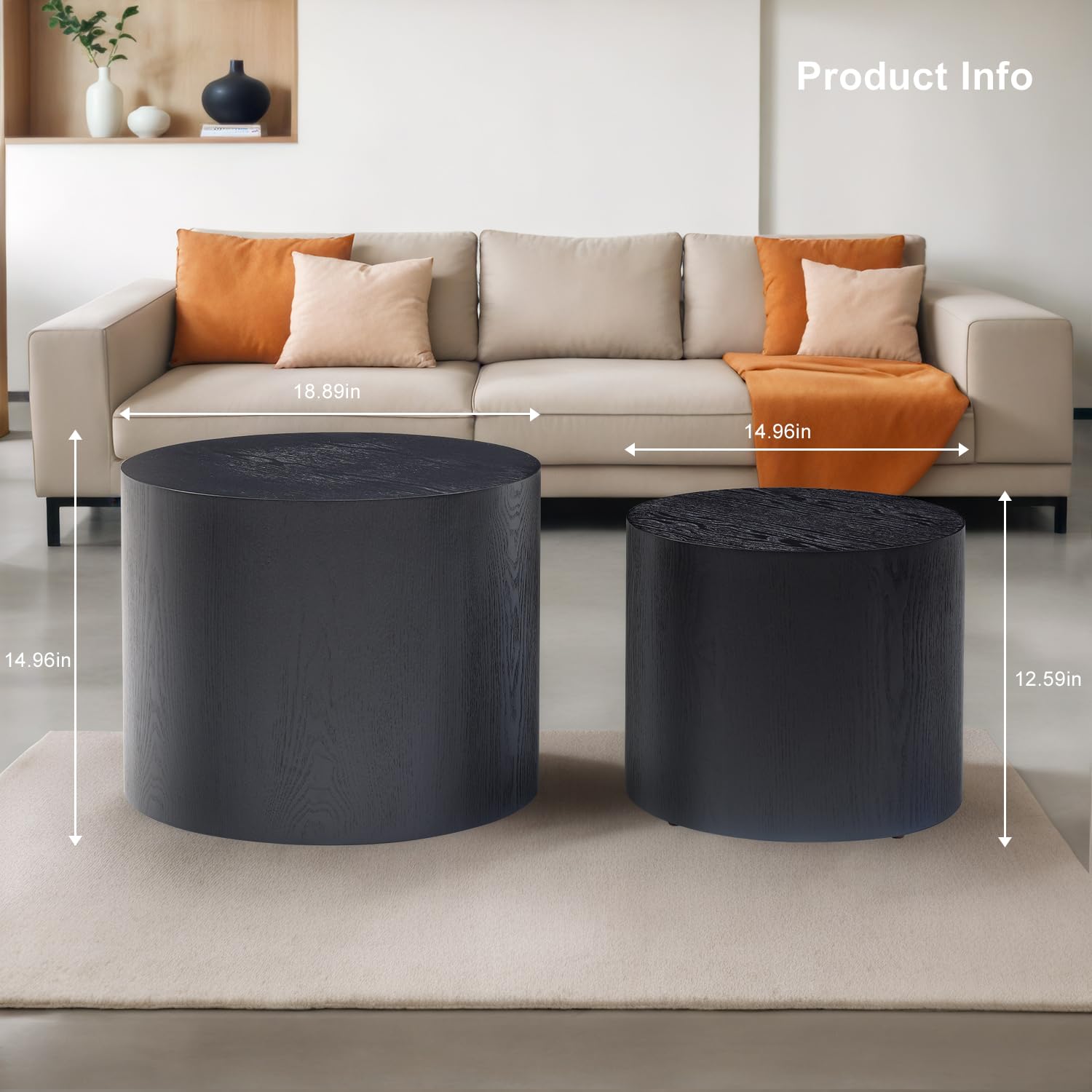 Nesting Coffee Table Set of 2, Modern Round Coffee Table with Non-Slip Feet, Wooden Circle Side Table and Accent Furniture for Bedroom Balcony Lounge Home Office, No Assembling, Black