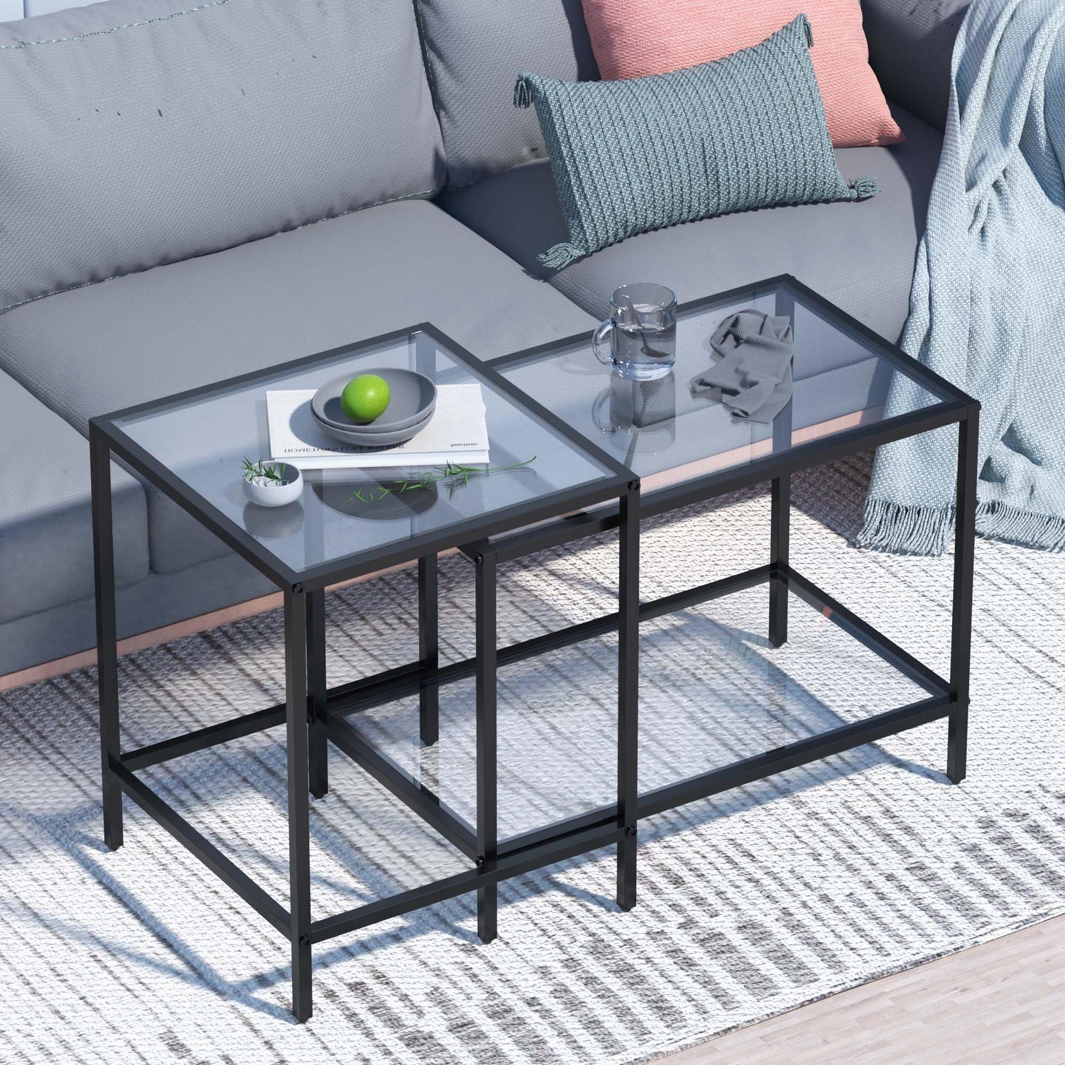Nesting Coffee Table,Small Glass Coffee Table Set of 2,Black Modern Square Sofa Side Tea Table for Living Room,Bedroom and Small Spaces,2 Tier Tempered Glass with Sturdy Metal Frame, Easy Assembly