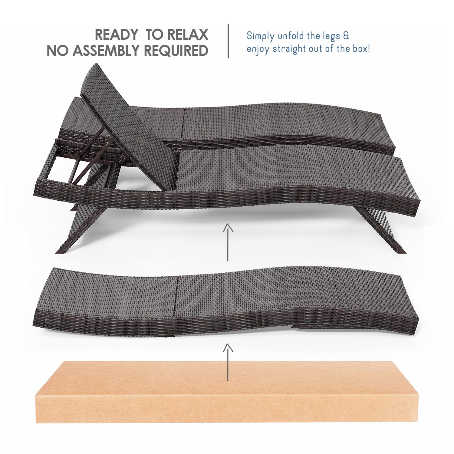 • Outdoor Chaise Lounge Set of 2: No assembly required for this pool lounge chair, just unfold the legs and enjoy straight out of the box. These patio chaise lounges are 26” W x 78.75” L x 38” H with 775 lbs weight capacity, and fold flat for compact storage.