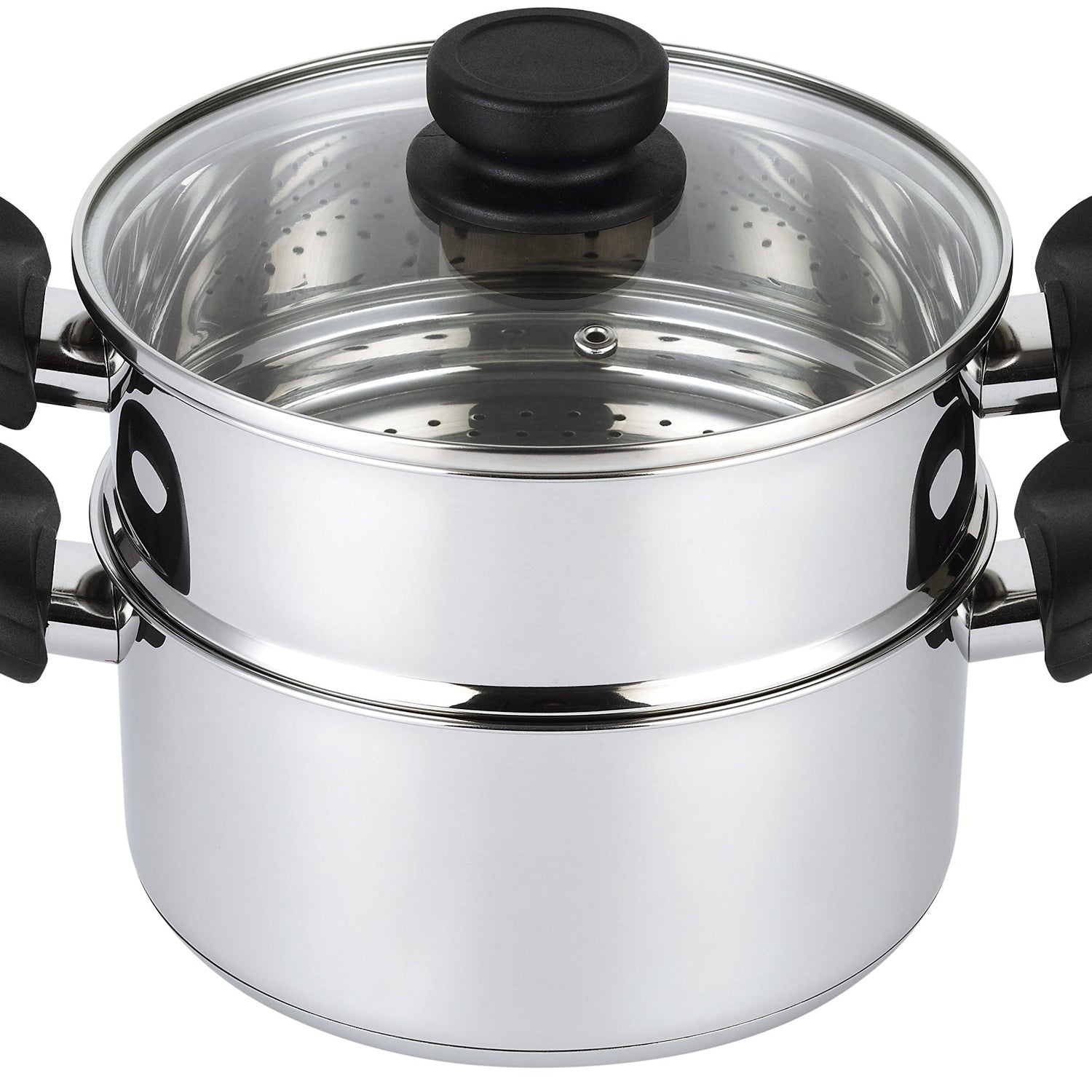 - The Nevlers 3 Piece Steaming Set is made with high quality, heavy duty 18/8 stainless steel. The steamer basket has an aluminum core at the bottom of the pot and a base that is capped by induction stainless steel that ensures the heat it thoroughly and evenly distributed.