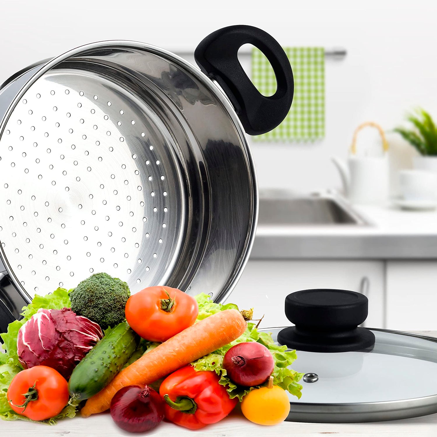 - Nuestro Juego de 3 Piezas de Olla de Vapor es fabricado con acero inoxidable 18/8 de alta calidad. La vaporera tiene un núcleo de aluminio en el fondo de la olla y una base que está tapada por inducción de acero inoxidable. Se puede utilizar en todas las superficies de cocción, incluyendo las placas de inducción, placas de cocina eléctricas, estufas portátiles, quemadores de gas, vidrio y cerámica. Dimensiones: 2.84 litros, 3.25 libras, 216 mm de profundidad con 330 mm de diámetro.