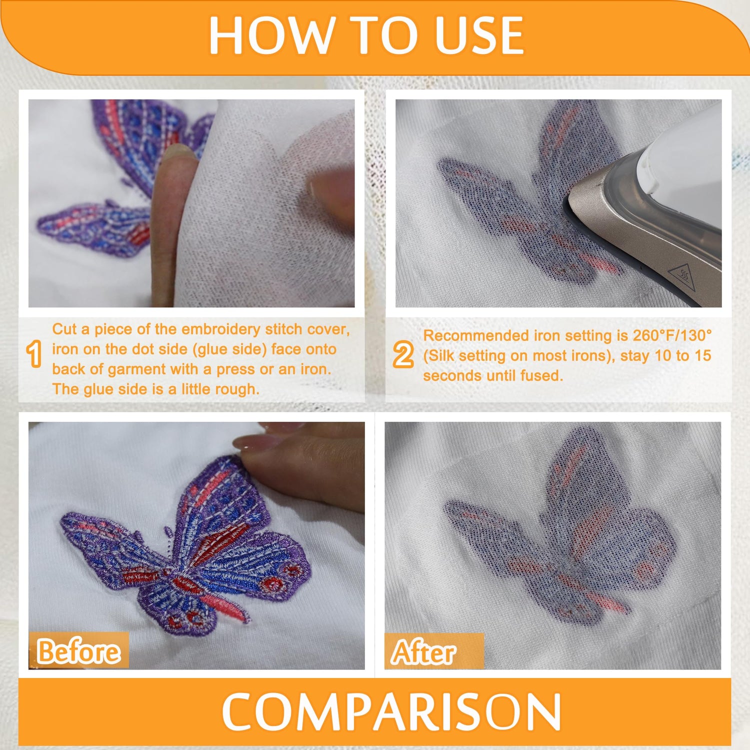 - ▶ Make Embroidery Soft to The Skin: Embroidery stitch cover is a soft covering made from 100% polyester iron on fusible backing that is used to cover the back of finished embroidery stitches on the inside of clothing. By covering the back of the embroidery, you are preventing threads from coming in contact with skin and causing irritation.