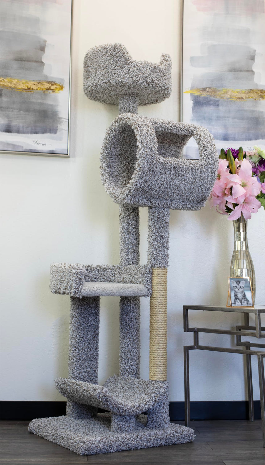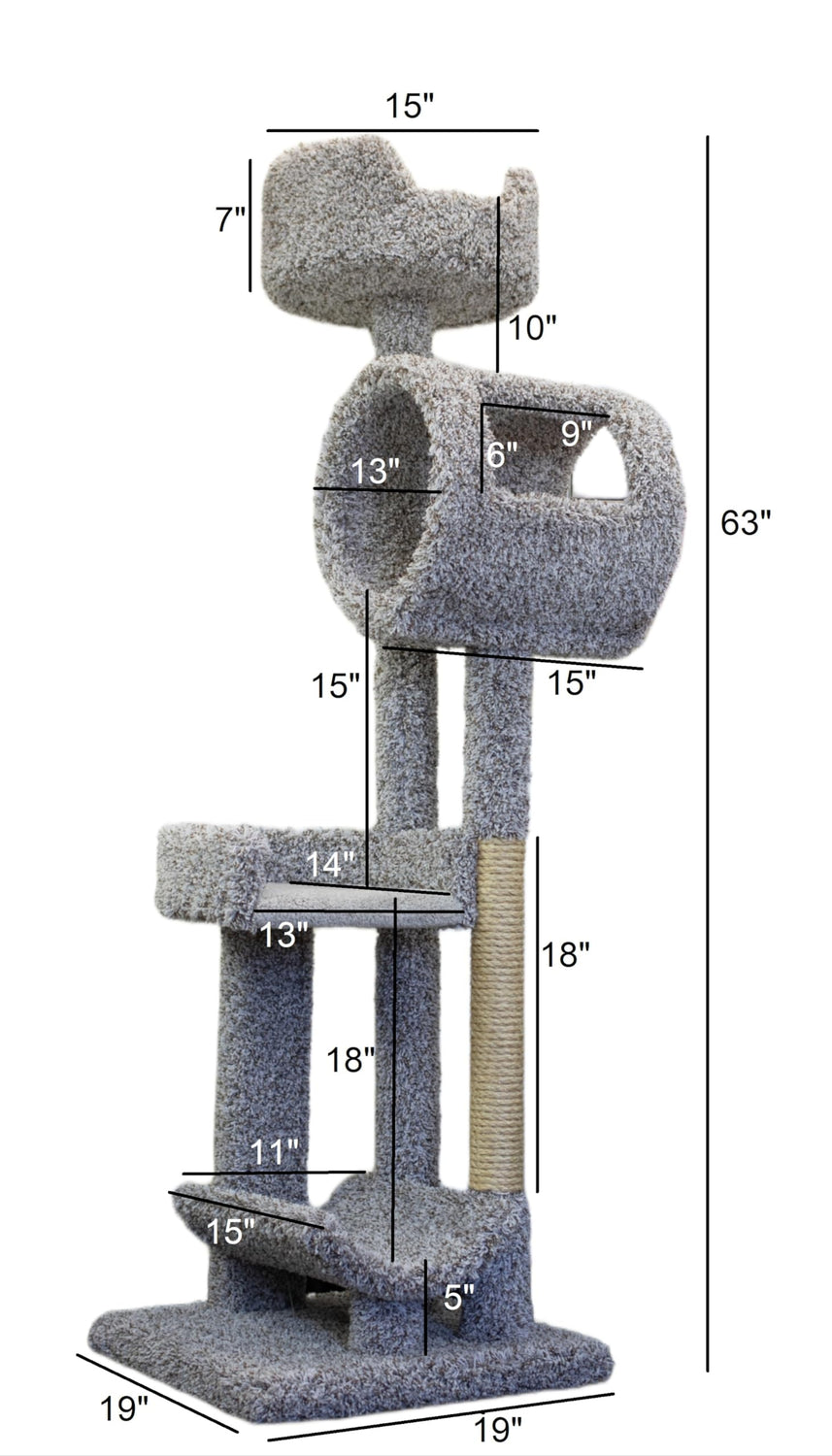 Details: New Cat Condos Staggered Cat Tower is a great choice for your kitties as it features a hammock shaped perch, an open-faced perch, a play tunnel with window and a deep edged perch. All these choices are a great add to your cat's kingdom. Providing these options ensures they have a place of their own to play, climb, scratch and sleep. Built with a wood foundation and covered with real carpet and a thick natural sisal rope this cat tower is sure to be a hit. Proudly handcrafted in the USA.