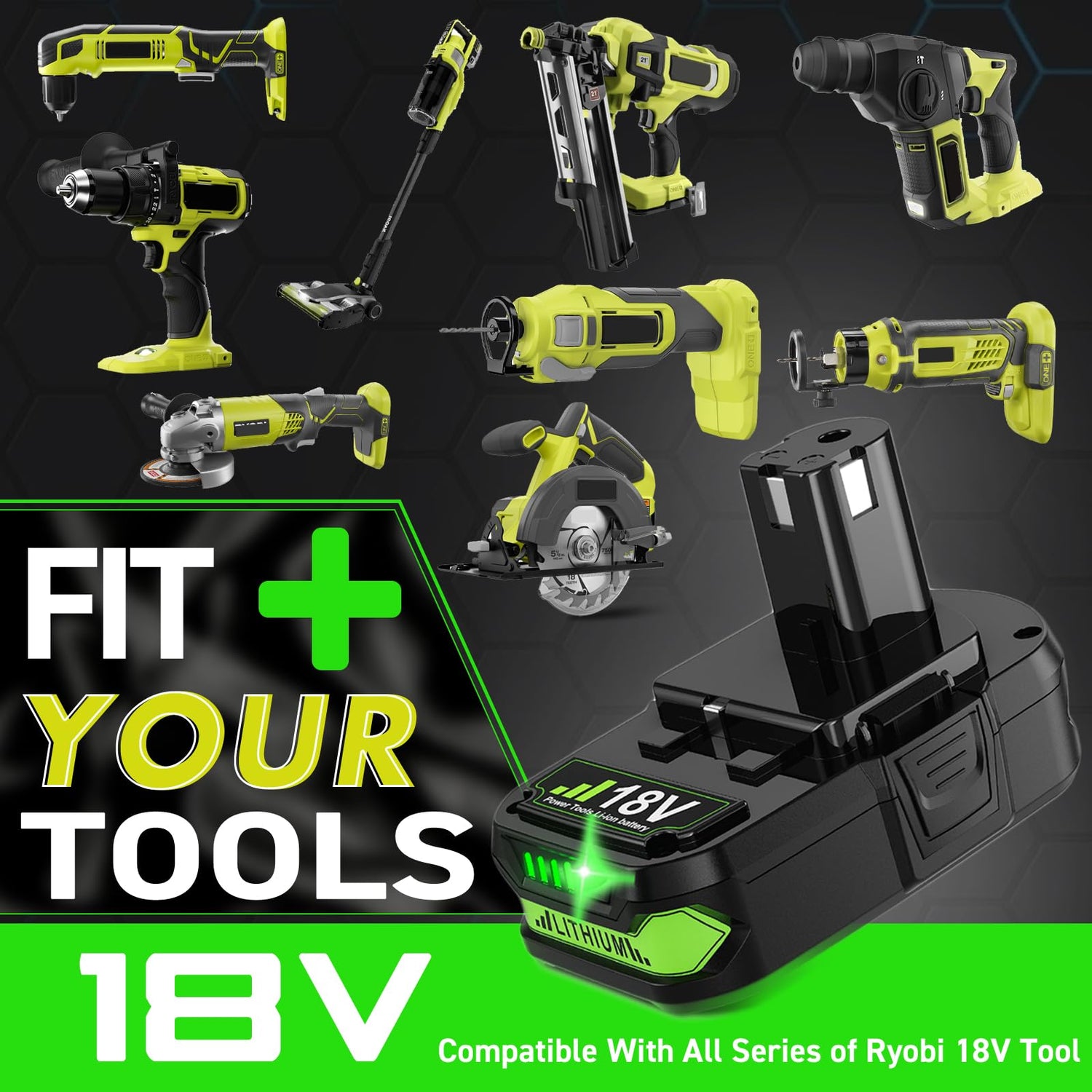 - Fit Your 18V Tools--Replacement for Ryobi 18V lithium-ion battery compatible with Ryobi ONEPLUS P102/ P103/ P104/ P105/ P107/ P108/ P100/ P197/ 190 18V cordless routers, string trimmer, reciprocating saws, circular saws, blower, etc other all Ryobi 18V system cordless power tools