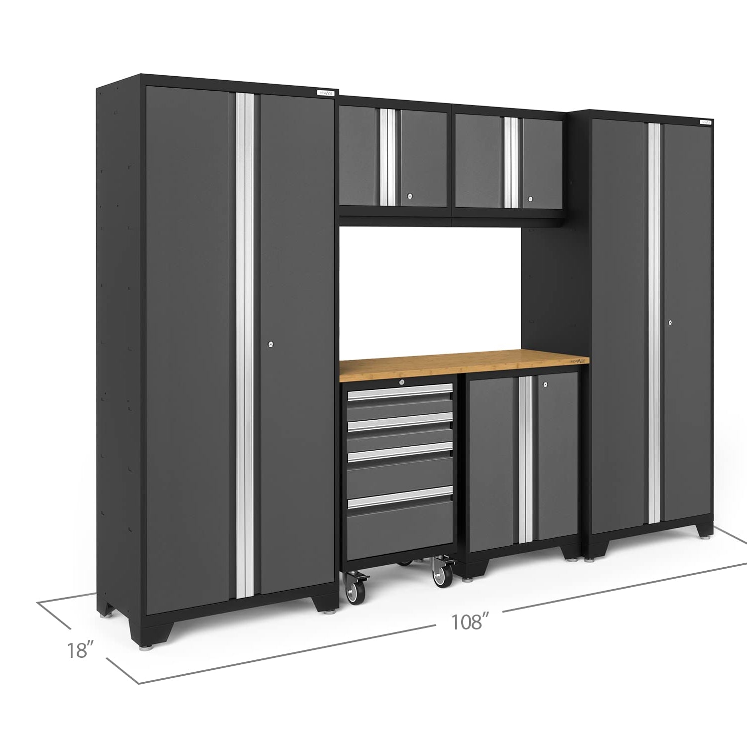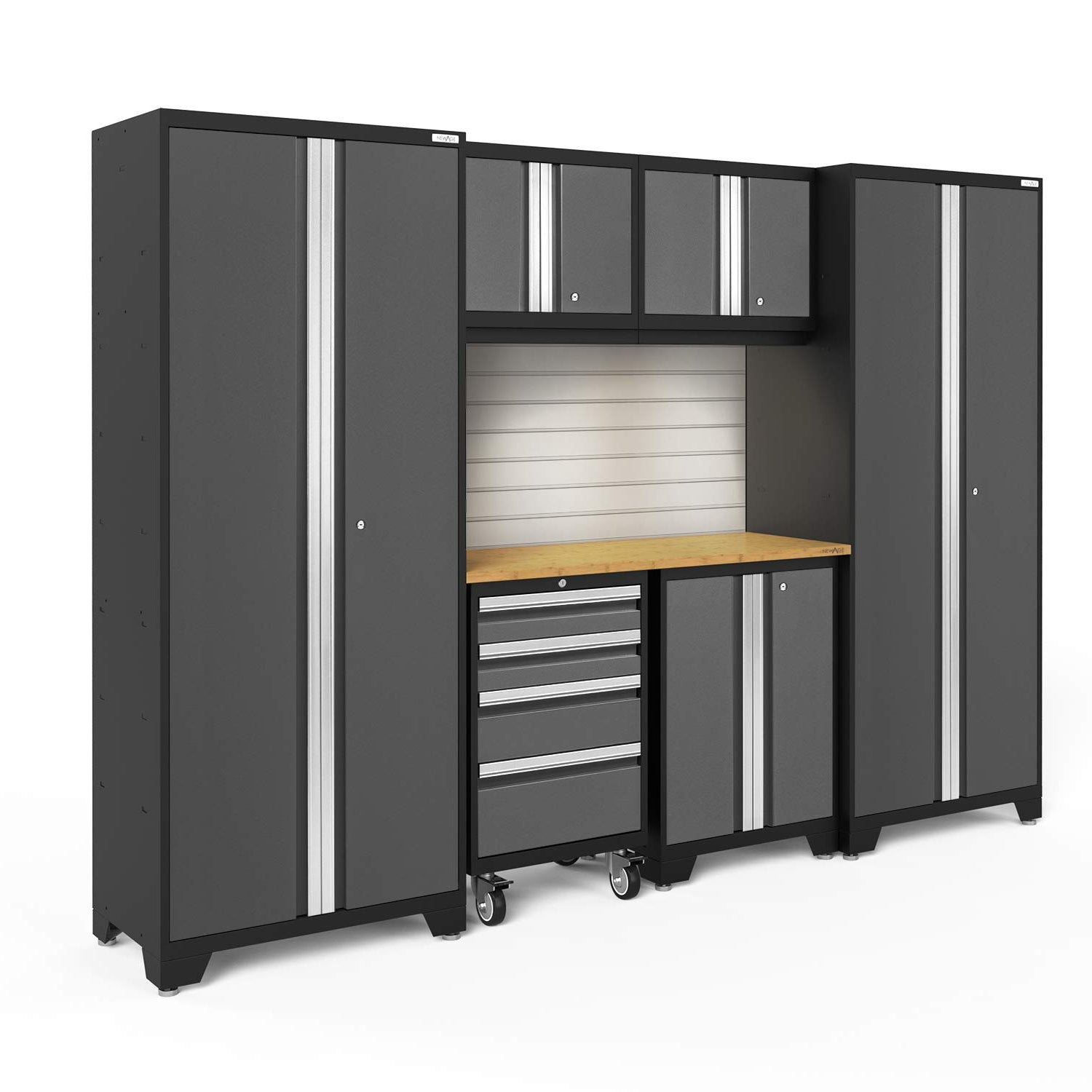 NewAge Products Garage Storage Cabinets Bold Series 7 Piece Sets Includes Worktop, Slatwall Backsplash, LED Lights, Multi-Use lockers, Wall, Base and Rolling Tool Cabinets, Gray, 50418