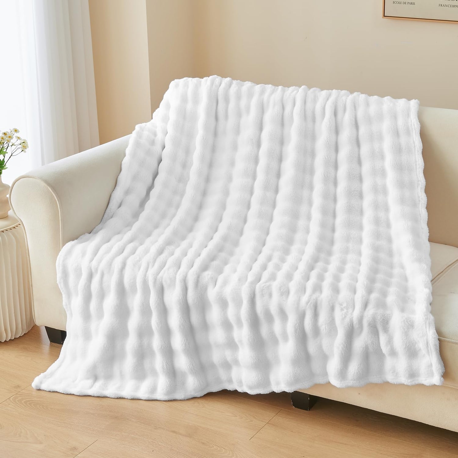 NEWCOSPLAY Throw Blanket for Couch White Super Soft Flannel Fleece 3D Bubble Lightweight Bed Blanket All Season Use (White, Throw(50"x60"))