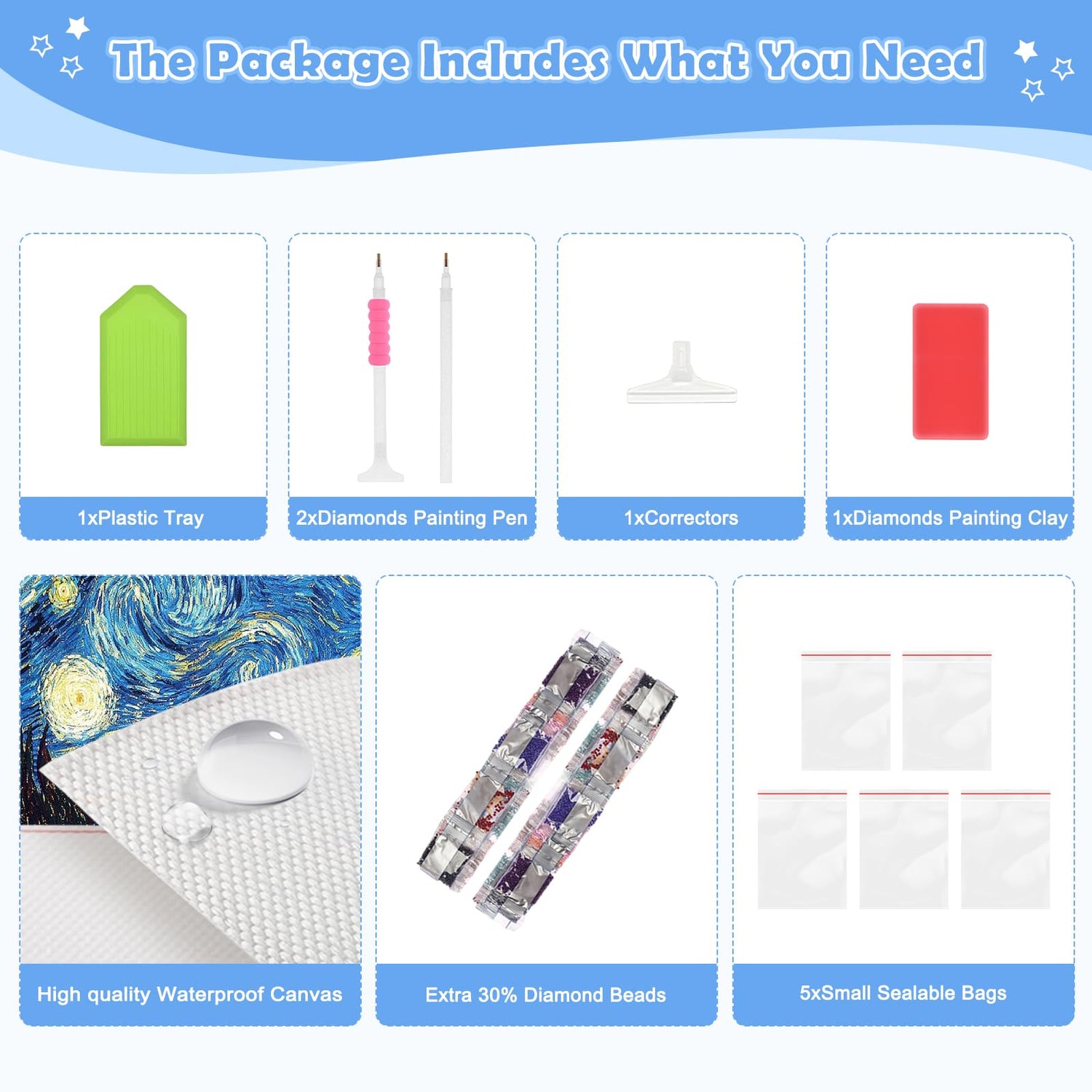 - 30% More Diamonds: No need to worry about running out! Each color comes with 30% more diamonds than needed. The kit includes all the tools you need to complete your diamond art with ease